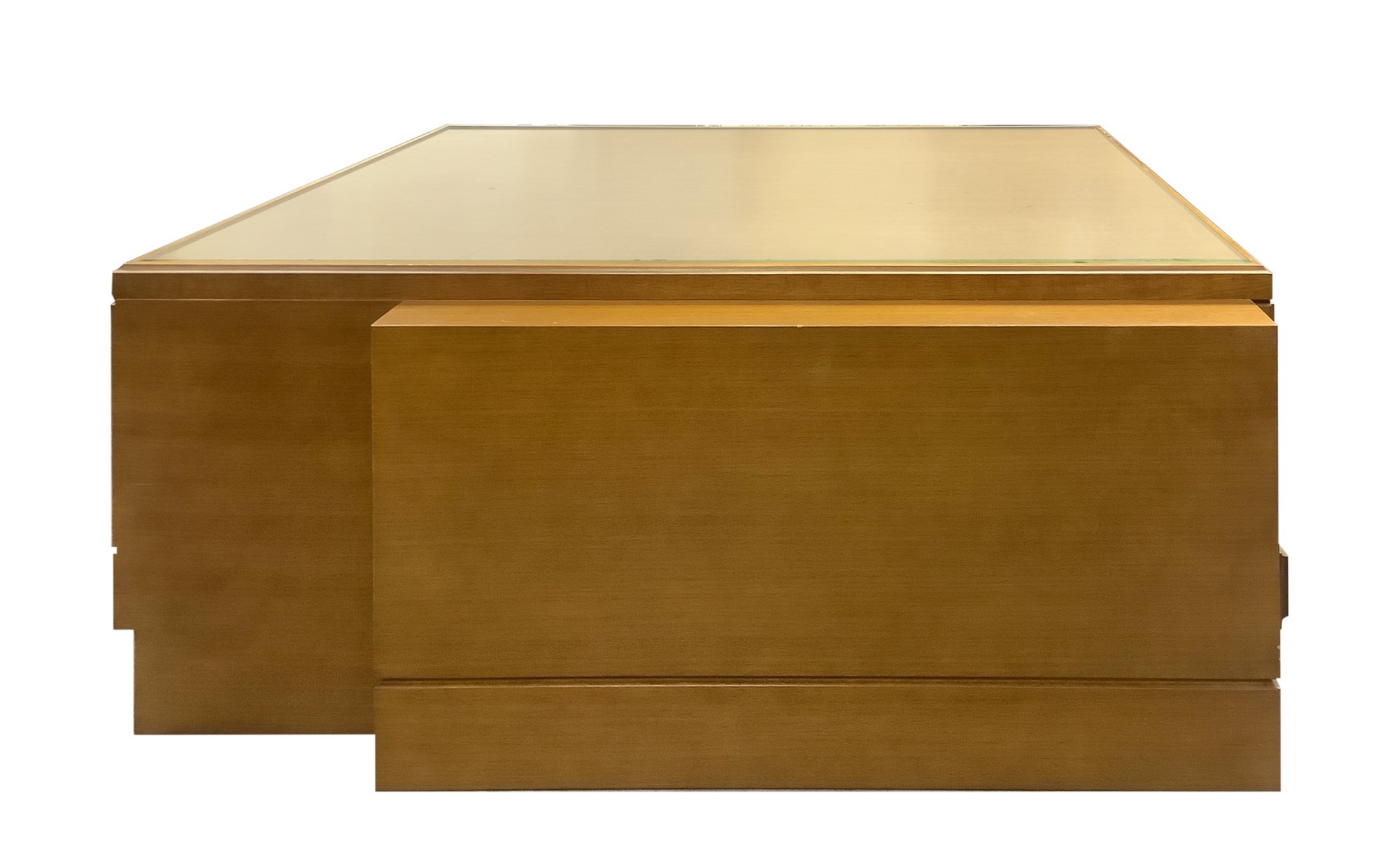 Tavolino basso in legno di rovere. H 45x110x90 cm Piano in vetro ,cassetto, ruote alla base