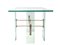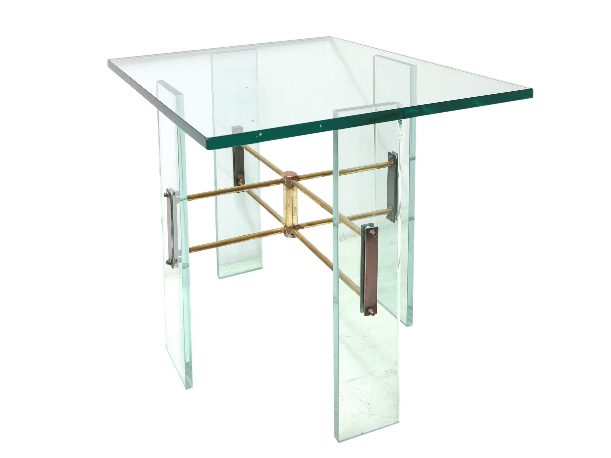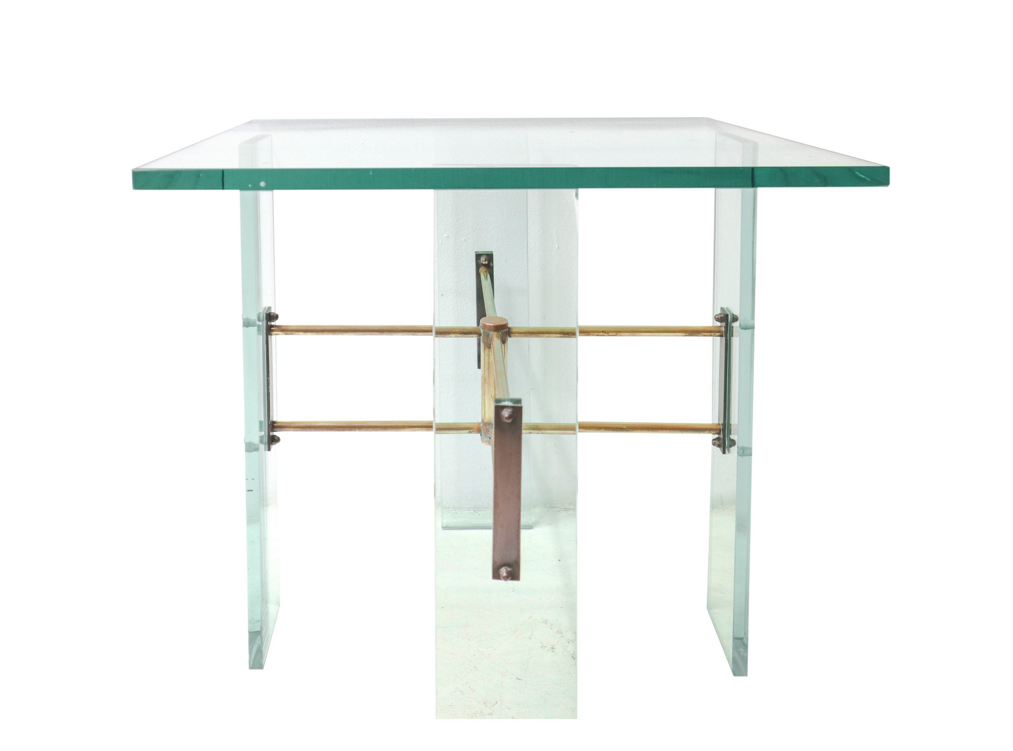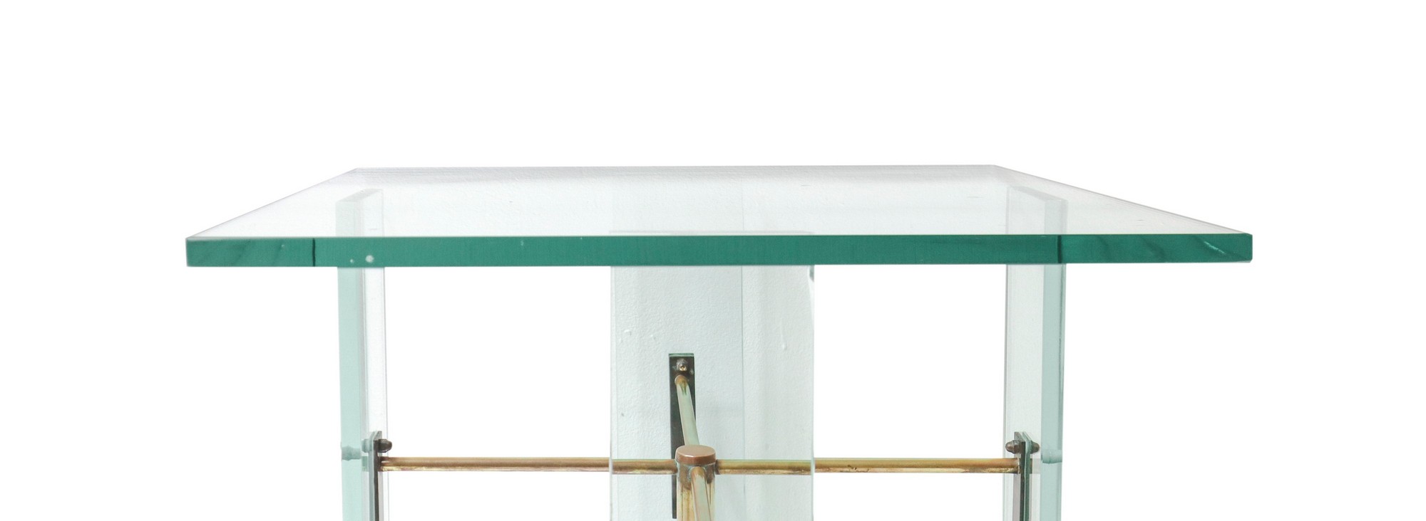 Struttura in ottone zapponato, piano in vetro, gambe in vetro.