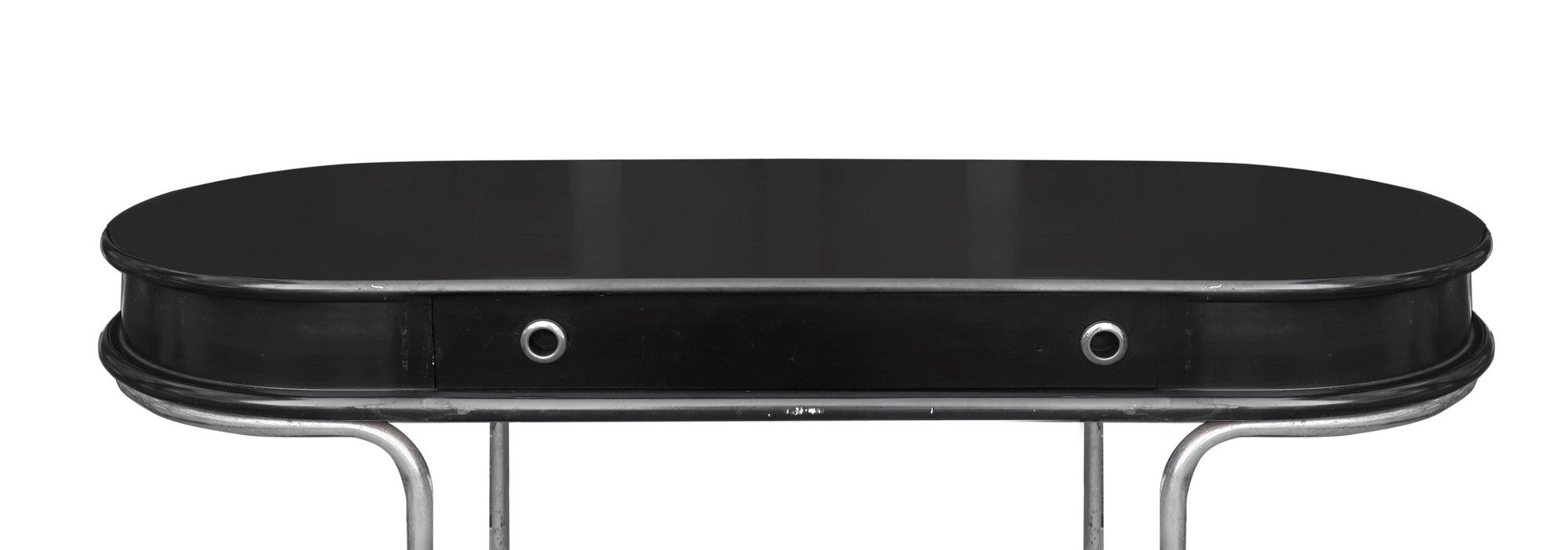 Console, prod. Italiana nello stile di Giotto Stoppino, 70's H cm 75x120, profondità cm 50 Piano in legno laccato di forma elittica, piedi in tubolare metallico cromato, tracce di ossidazioni, segni d'uso.