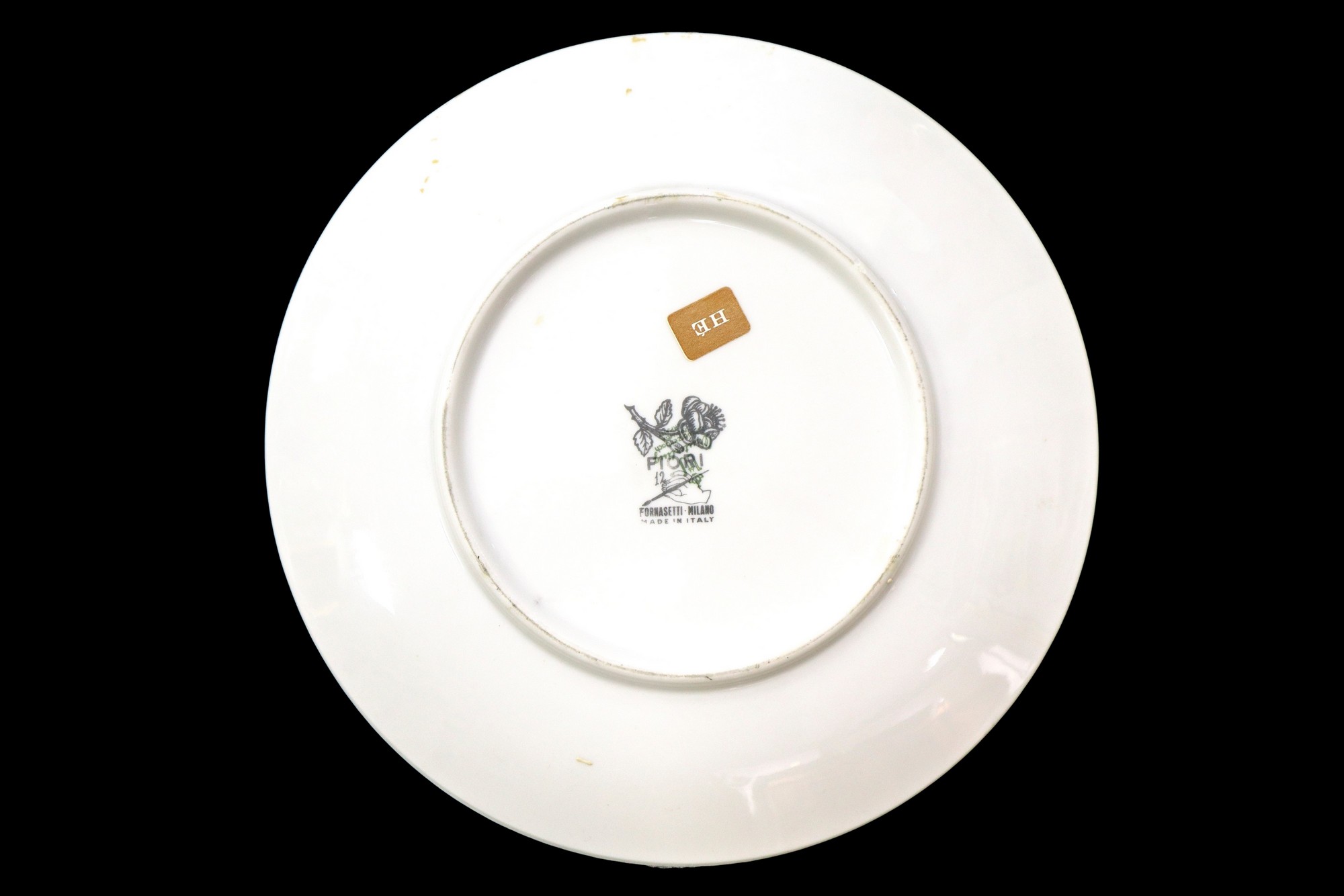 Piero Fornasetti - Piatto in porcellana bianca, serie limitata e numerata (n°12) intitolata "fiori", 60's Diametro cm 25 Sul fondo bianco spiccano un mazzo interamente decorati con l'utilizzo del colore giallo, verde e rosso e viola