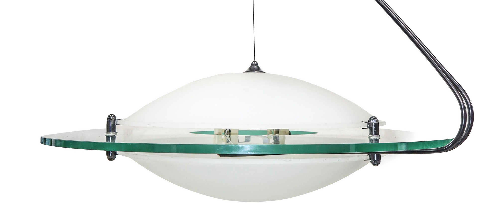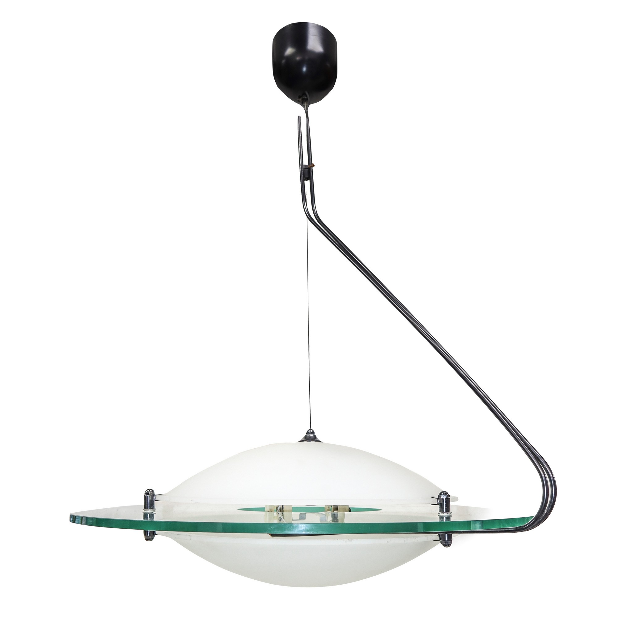 Sospensione con tubolare a L, diffusore in vetro di Murano trasparente Diametro 60, H cm 75 Diffusore a coperchio in vetro satinatoDiffusore a coperchio in vetro satinato