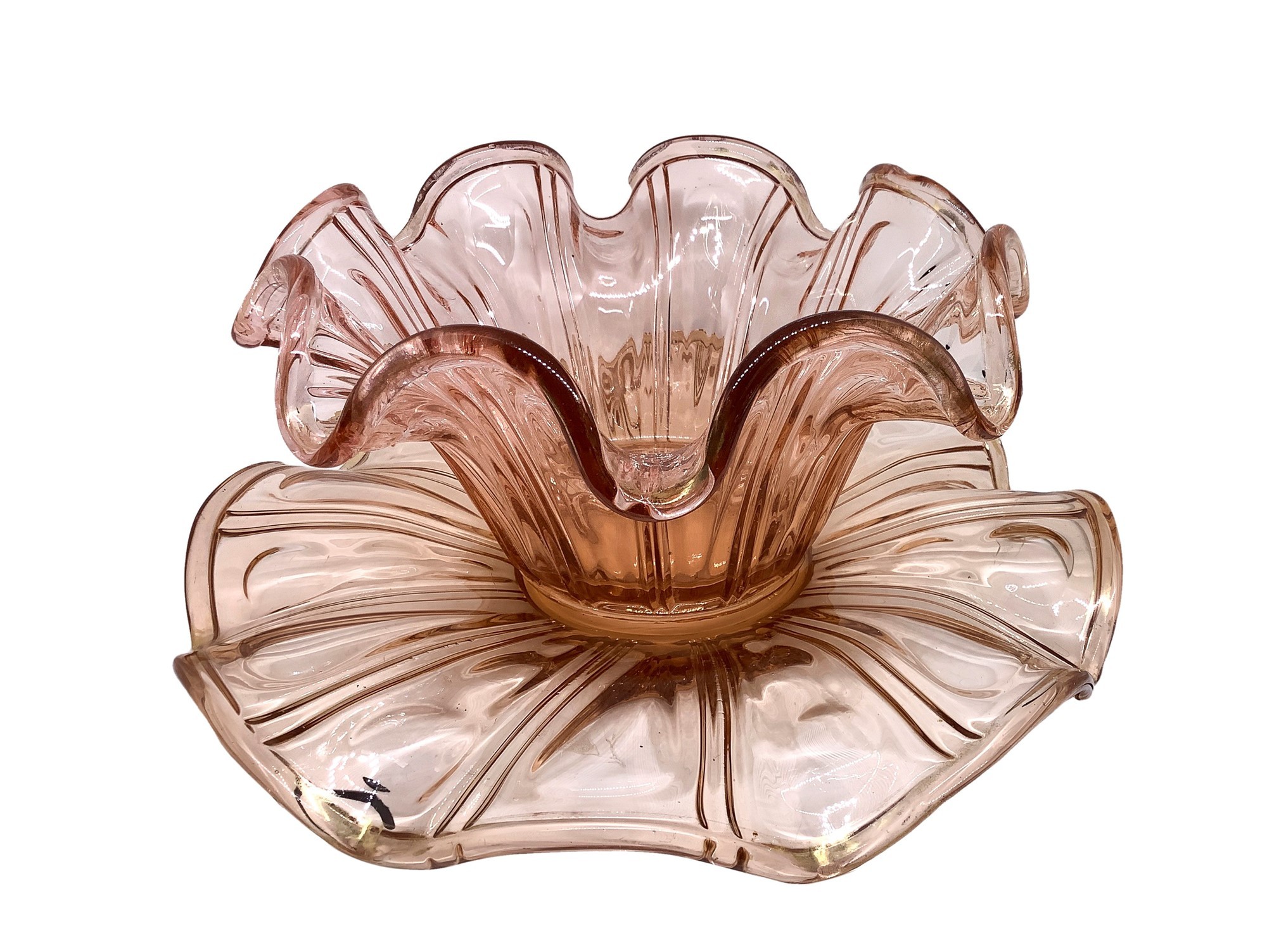 Centrotavola formato da piatto più alzata d 34 cm, b 11 cm, h 24 cm In vetro rosa e stile Liberty.In vetro rosa e stile Liberty.