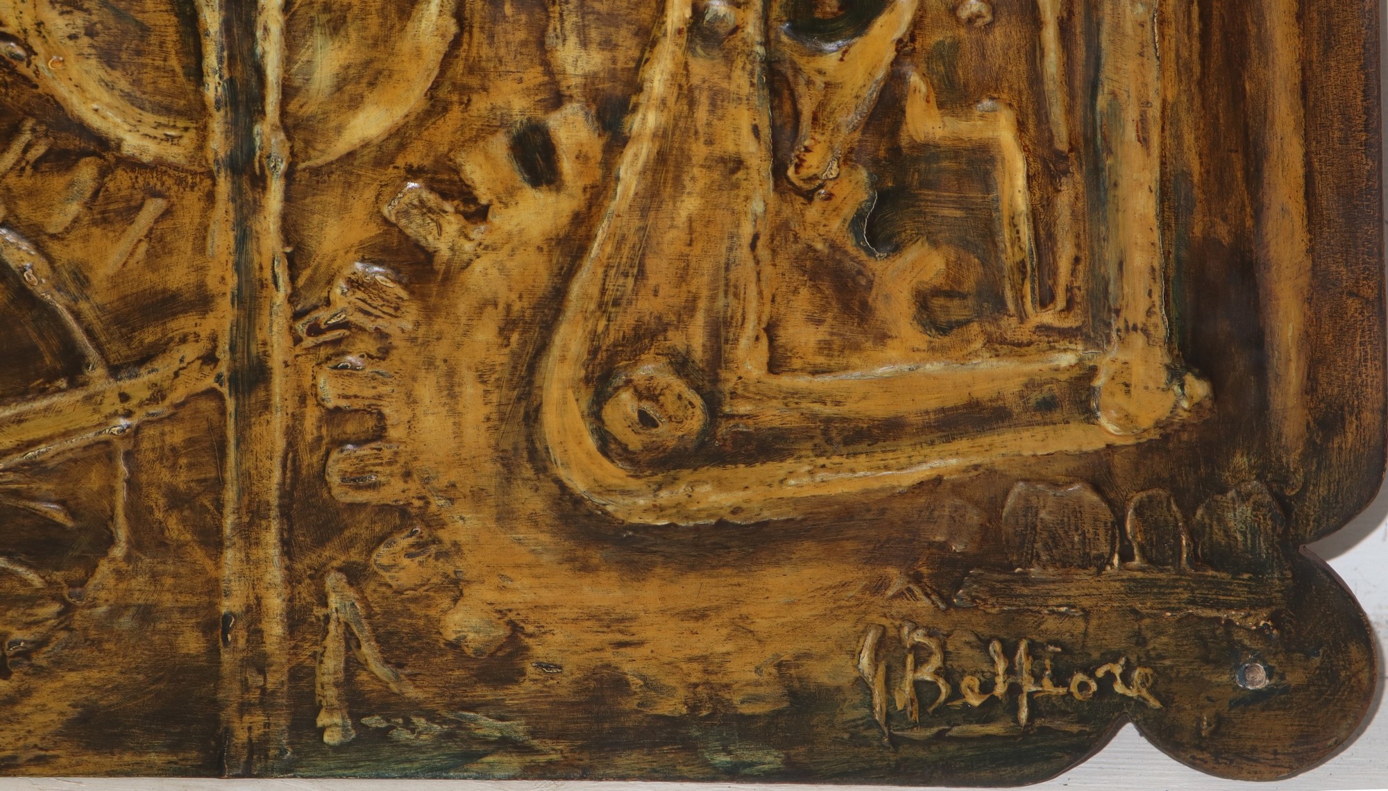 G. Belfiore - Panello decorativo raffigurante Ingranaggi e croce nei toni dell'ocra