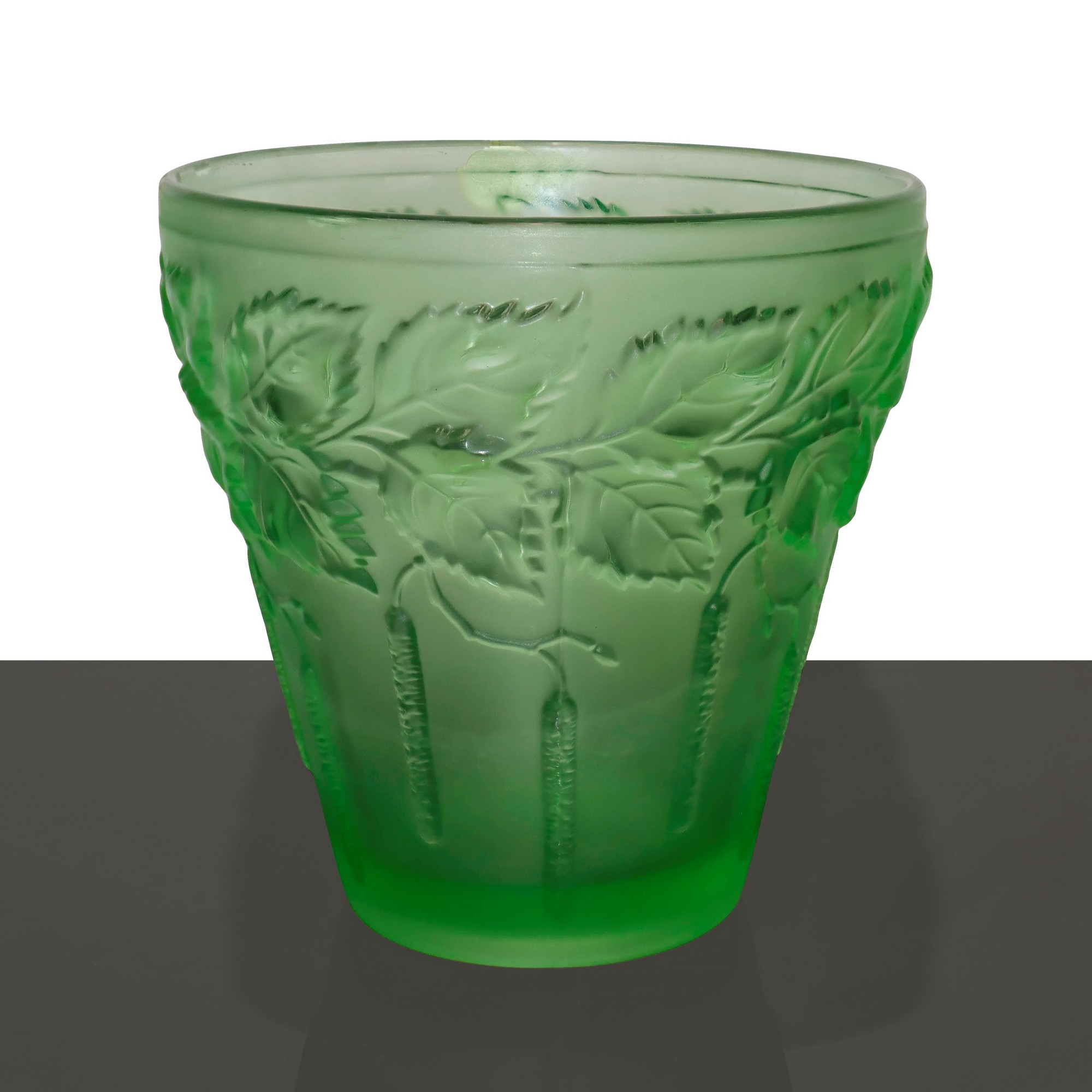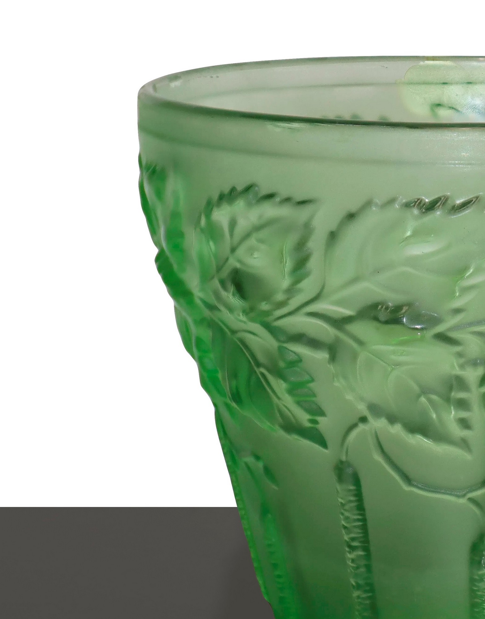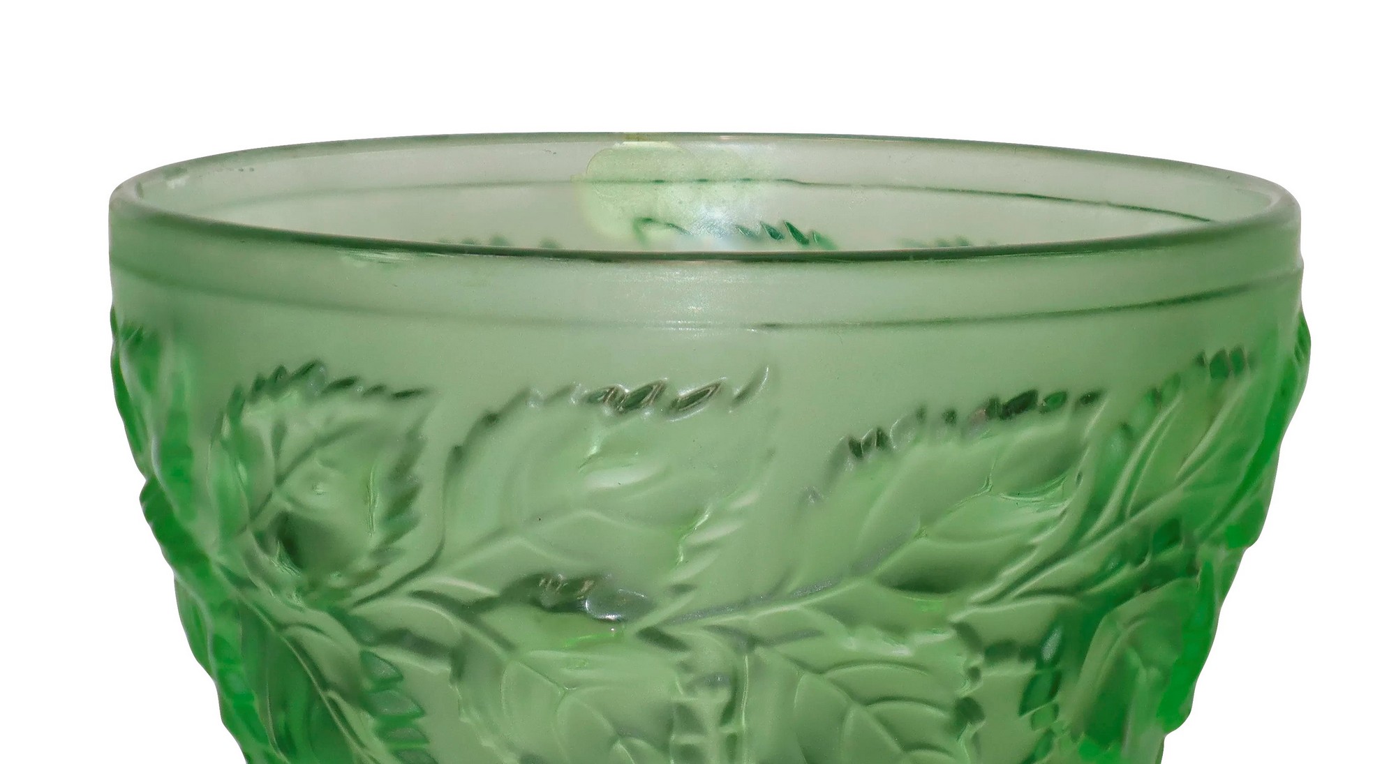 Vaso Barolac in vetro verde Bohemia, Late 19° secolo h cm 16 x d 16 Superficie esterna smerigliata con decoro di foglieSuperficie esterna smerigliata con decoro di foglie