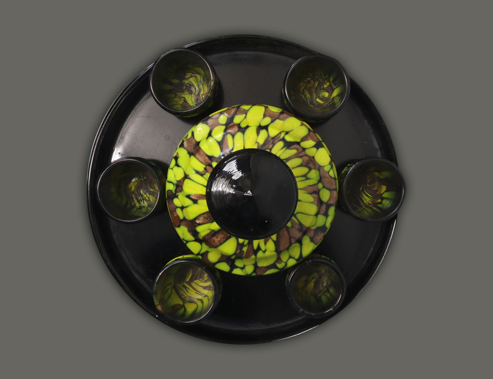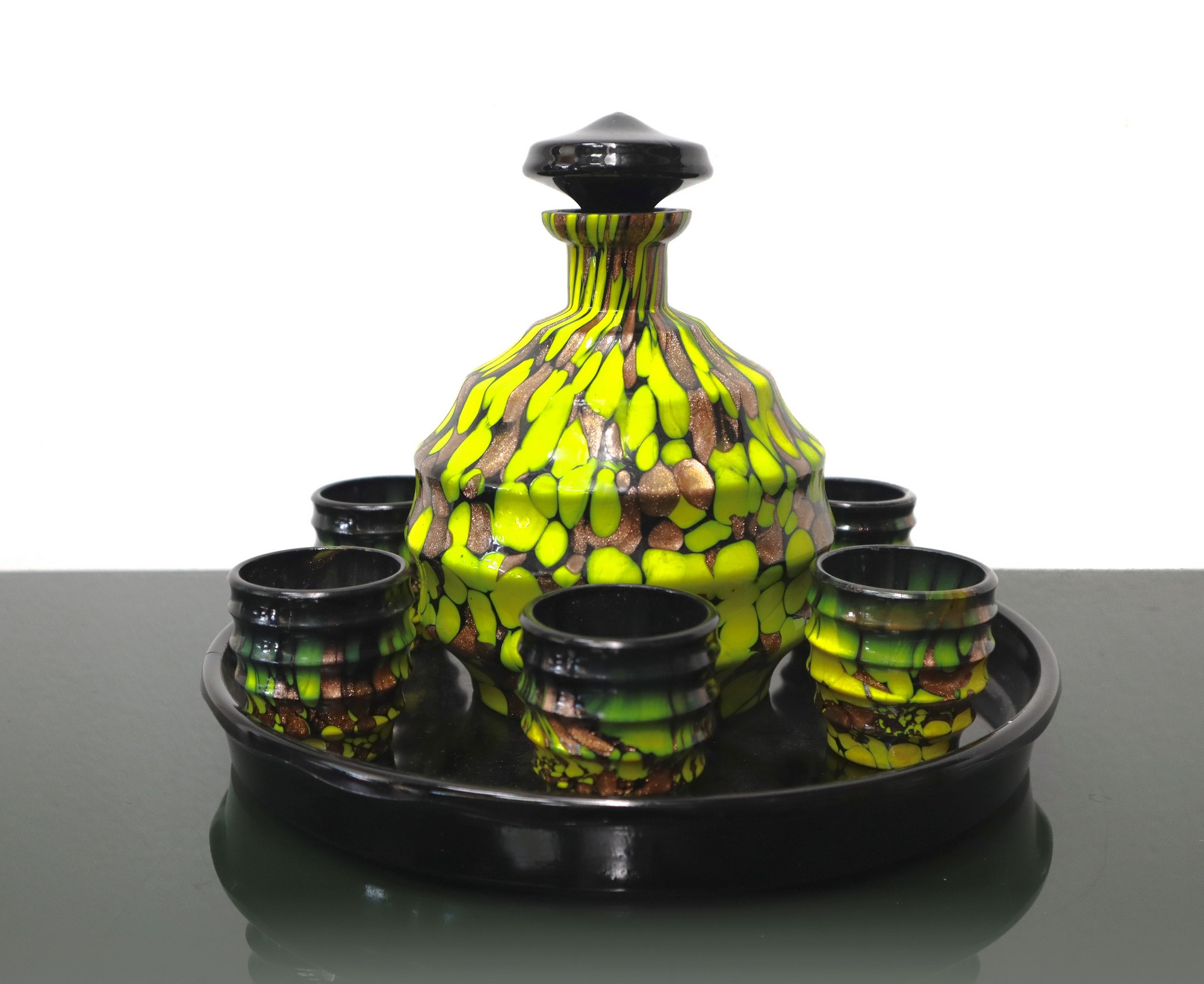 Servizio da rosolio in pasta di vetro Muranese e avventurina, Ages 20/30 Composto da un vassoio, N.6 bicchieri e bottiglia. Stile NasonComposto da un vassoio, N.6 bicchieri e bottiglia. Stile Nason