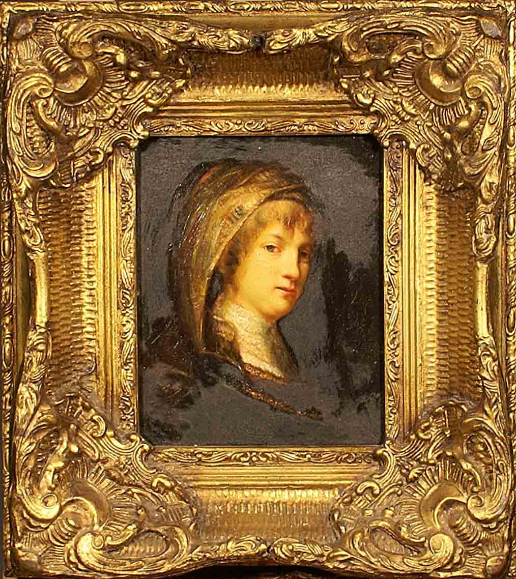 Rembrandt, copia da, "Ritratto di giovinetta". olio su tavola, cm. 25x20.