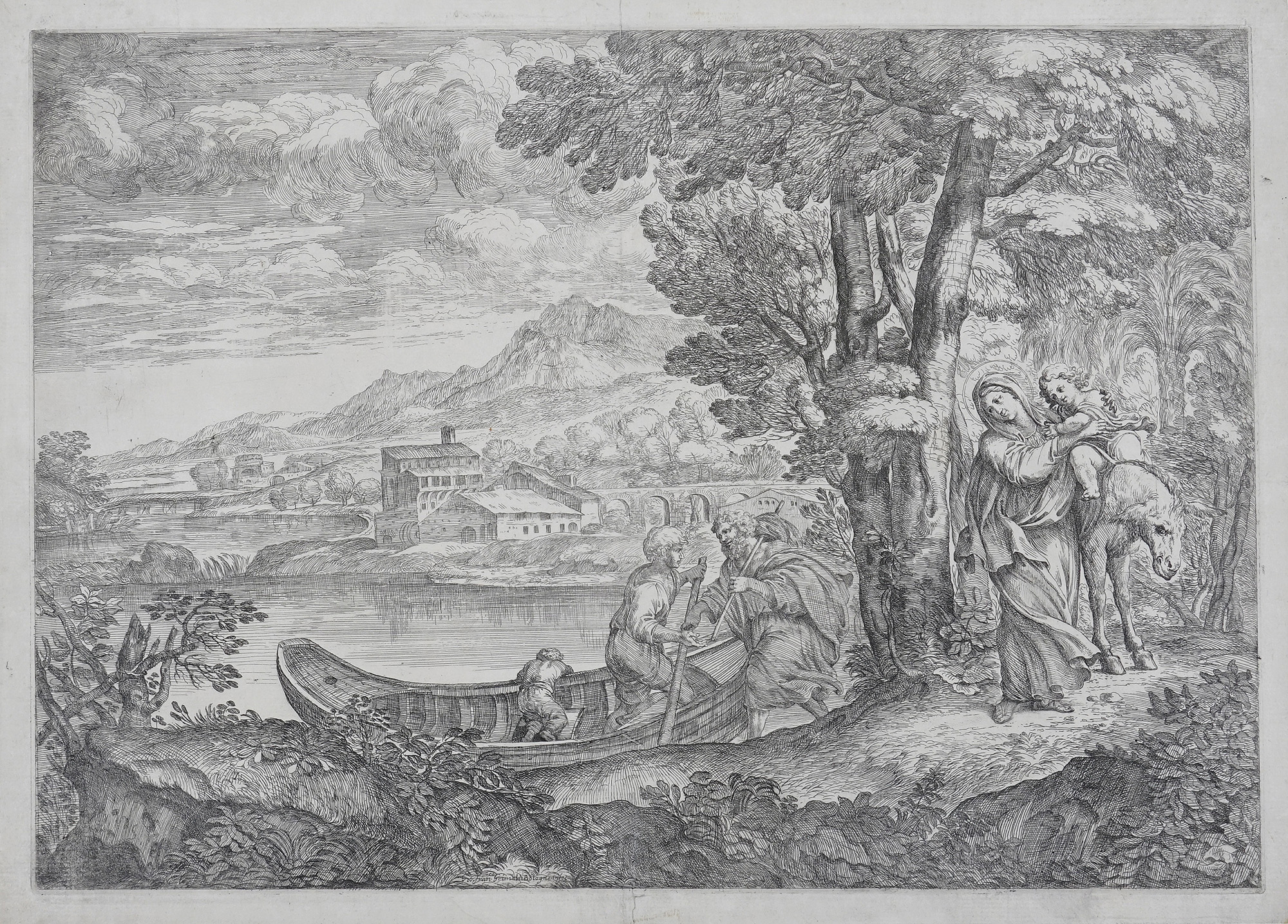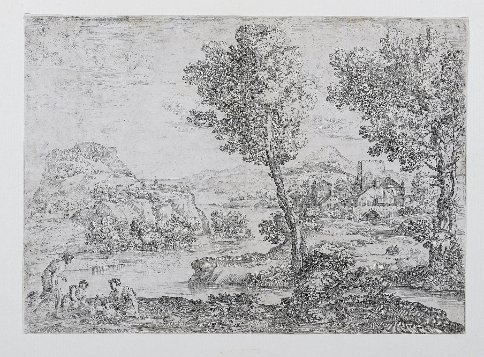 Giovanni Francesco Grimaldi, Paesaggio con la fuga in Egitto / Paesaggio con uomo in piedi e due seduti sulle rive di un fiume. 1630-1680. Acquaforte. mm 327x463. Foglio: mm 357x493. Bartsch, XIX, 51. Bellini (Grimaldi), 2. Firmata sulla lastra in basso al centro "Gio. fran.co Grimaldi Bologne in fec". Ottima prova nel II stato su 2. Carta vergellata pesante priva di filigrana. / Acquaforte. mm 330x465. Bartsch, XIX, 53. Bellini (Grimaldi), 46. In basso a destra "Ticiano Venetia". Bella prova su carta vergellata avanti l'excudit di Daman. (2)