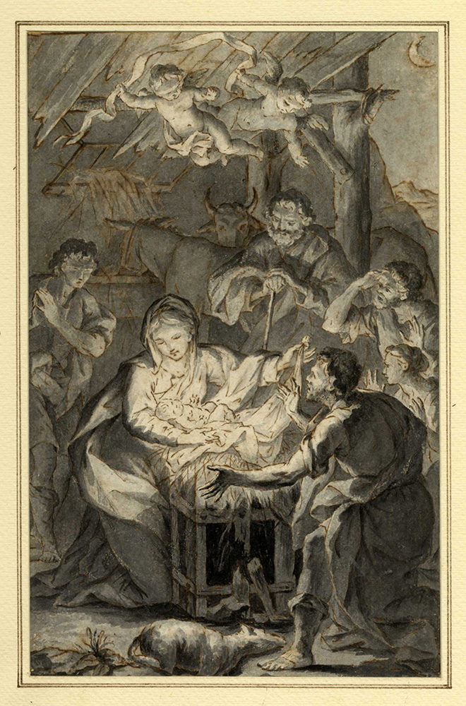 Anonimo della seconda metà del XVII secolo, Adorazione dei pastori. 1670 ca. Penna e inchiostro bruno, pennello e acquerello grigio, carta vergellata bianca. mm 235x155. (1)