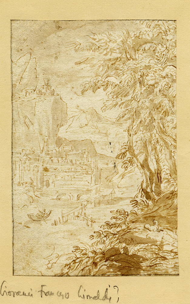 Lodewijk Toeput (Il Pozzoserrato), Paesaggio montuoso con fiume e città Penna e inchiostro bruno, pennello e acquerello marrone chiaro, carta vergellata color avorio priva di filigrana. mm 190x124. Il disegno è pervenuto con assegnazione al Pozzoserrato, in basso sul montaggio moderno è presente altra indicazione a matita "Giovanni Francesco Grimaldi". Provenienza: Igino Cerastico (Trieste 1925 – Lugano 1979), noto personaggio dell'ambiente imprenditoriale-finanziario milanese, editore nonché collezionista d'arte. Italia, collezione privata. (1)