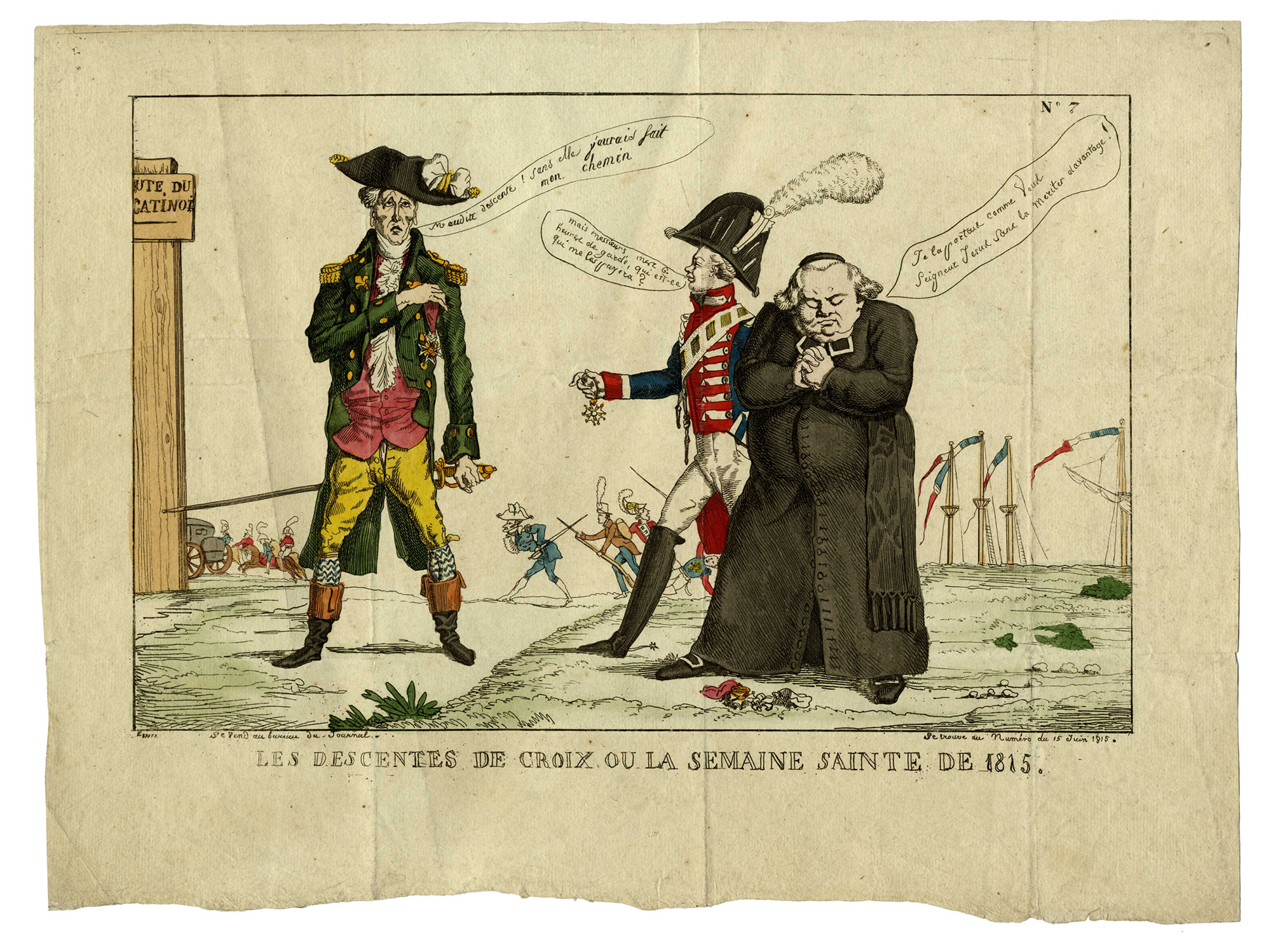 Anonimo della prima metà del XIX secolo, Les descentes de croix ou la semaine sainte de 1815. Acquaforte in coloritura. mm 255x355. Foglio: mm 265x358. Al margine inferiore a sinistra "Se vend au bureau du Journal" e a destra "Se trouve au numéro du 15 Juin 1815.", al centro il titolo. Stampa satirica sul ritorno di Napoleone I in Francia dalla serie Retour de l'île d'Elbe e pubblicata in Le Nain Jaune, ou Journal des Arts, des Sciences et de la Littérature. Il giornale sostenne Napoleone durante i cento giorni e fu soppresso al secondo ritorno dei Borboni, il 15 luglio 1815. (1)