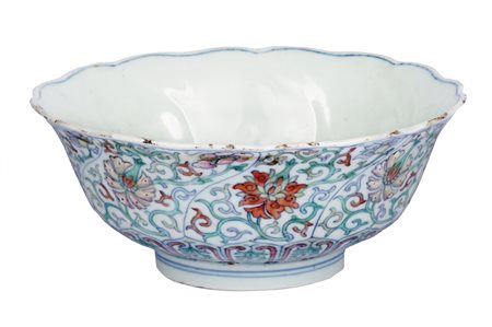 Arte cinese, Ciotola in porcellana Doucai. Dinastia Qing (1644-1912), XVIII secolo. Ciotola decorata internamente in blu con corona a otto pannelli, alternativamente riempiti da un frutto o da un fiore separati da uno stilizzato nodo pendente. Entro la corona un ottagono con motivo ispirato a piante e fiori palustri. Bordo leggermente lobato con linea blu all'interno. L'esterno in policromia è decorato da otto fiori in posizione simmetrica. Sulla base marchio Qianlong (1736-1795). Altezza: cm 7,5. Diametro: cm 17,5. Base: cm 7,5. (1)