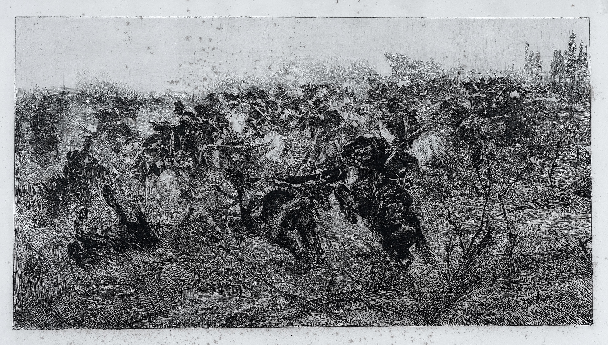 Giovanni Fattori, Carica di cavalleria. 1883-1884. Acquaforte su rame. mm 252x467. Foglio: mm 348x540. Baboni, CLXXVIII. Bonagura, 22. Timpanaro, 11. Esemplare nel I stato su 2. La lastra fu incisa per la Società delle Belle Arti di Firenze sul tema del dipinto Carica del 1872 e tirata una prima volta nel 1884 ed una seconda nel 1889 a 50 esemplari dallo stampatore Gastaldi di Torino. (1)