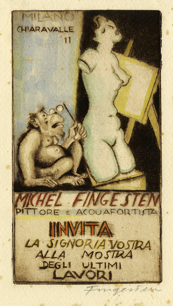 Michel Fingesten, Lotto composto di 2 ex libris. 1) Invito alla mostra dei suoi ultimi lavori. Puntasecca colorata a mano. mm 192x102. Foglio: mm 220x125. MIRABELLA-BARDAZZI-BALLERINI, 399. Firmata a matita in basso a destra, controfirma, titolo e indirizzo della sede d'invito in lastra. 2) G. S. Puntasecca. mm 258x185. Foglio: mm 227x185. Firmata a matita a destra, "Probedruck" a matita a sinistra. (2)
