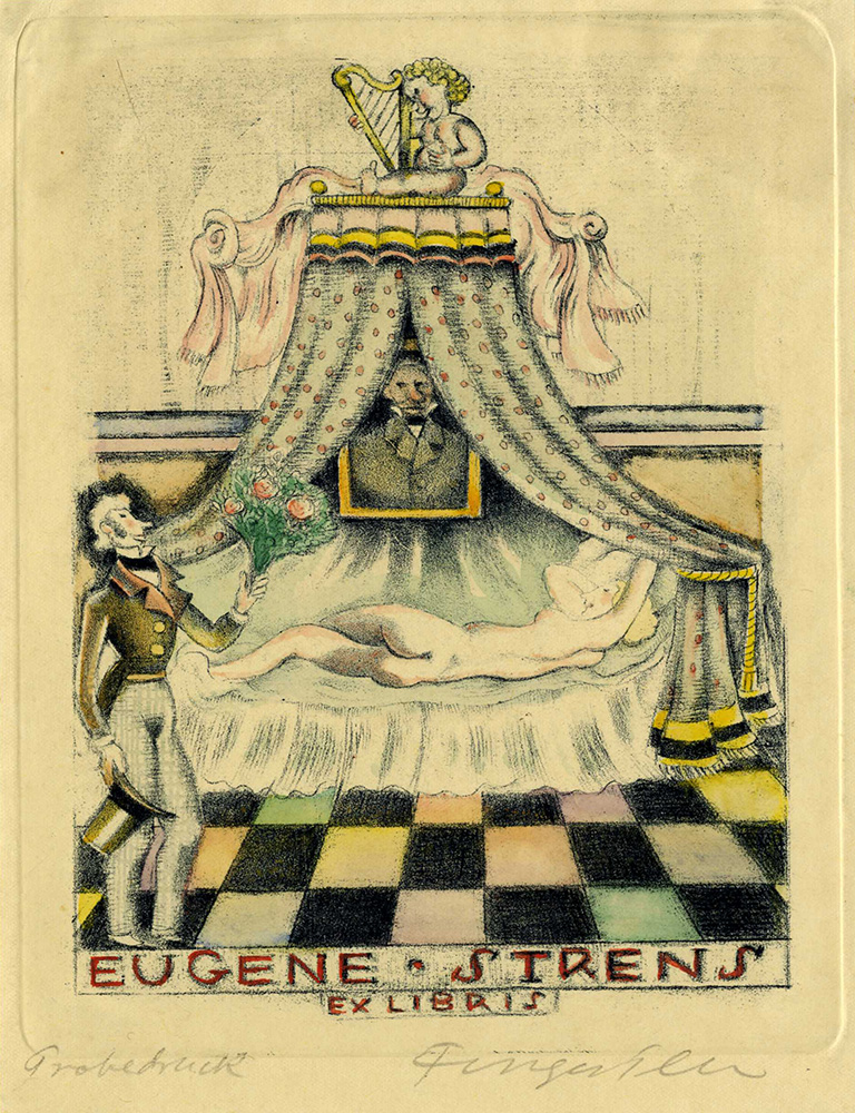Michel Fingesten, Lotto composto di 2 ex libris. 1) Eugene Strens. Acquaforte acquerellata. mm 19,5x15. Foglio: mm 210x158. NECHWATAL, P. 55. Firmata a matita in basso a destra, "Probedruck" a matita in basso a sinistra. 2) Eugène Strens. Acquaforte. mm 127x75. Foglio: mm 205x152. DEEKEN, 648. Firma a matita in basso a destra. (2)
