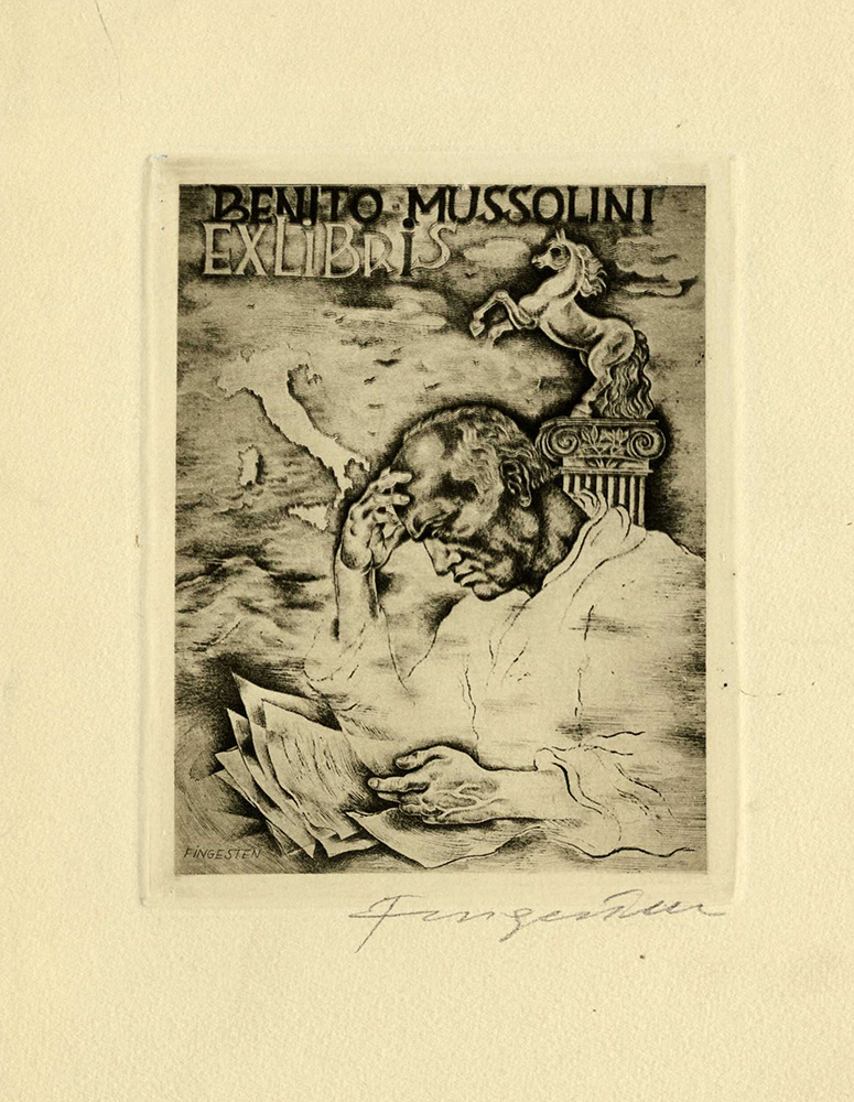 Michel Fingesten, Lotto composto di 3 ex libris. 1) Ex libris Benito Mussolini. Acquaforte. mm 118x90. foglio: mm 198x155. MIRABELLA-BARDAZZI-BALLERINI, 379. Firmata a matita in basso a destra, controfirmata in lastra in basso a sinistra. 2) S. G. Ex libris Putto Halt Die Initialengs. Puntasecca. mm 80x42. Foglio: mm 85x45. DEEKEN, 606. Firmato a matita in basso a destra. 3) Stegmann ex libris. acquaforte. mm 100x60. Foglio: mm 111x65. DEEKEN, 634. Firma a matita in basso a destra. (3)