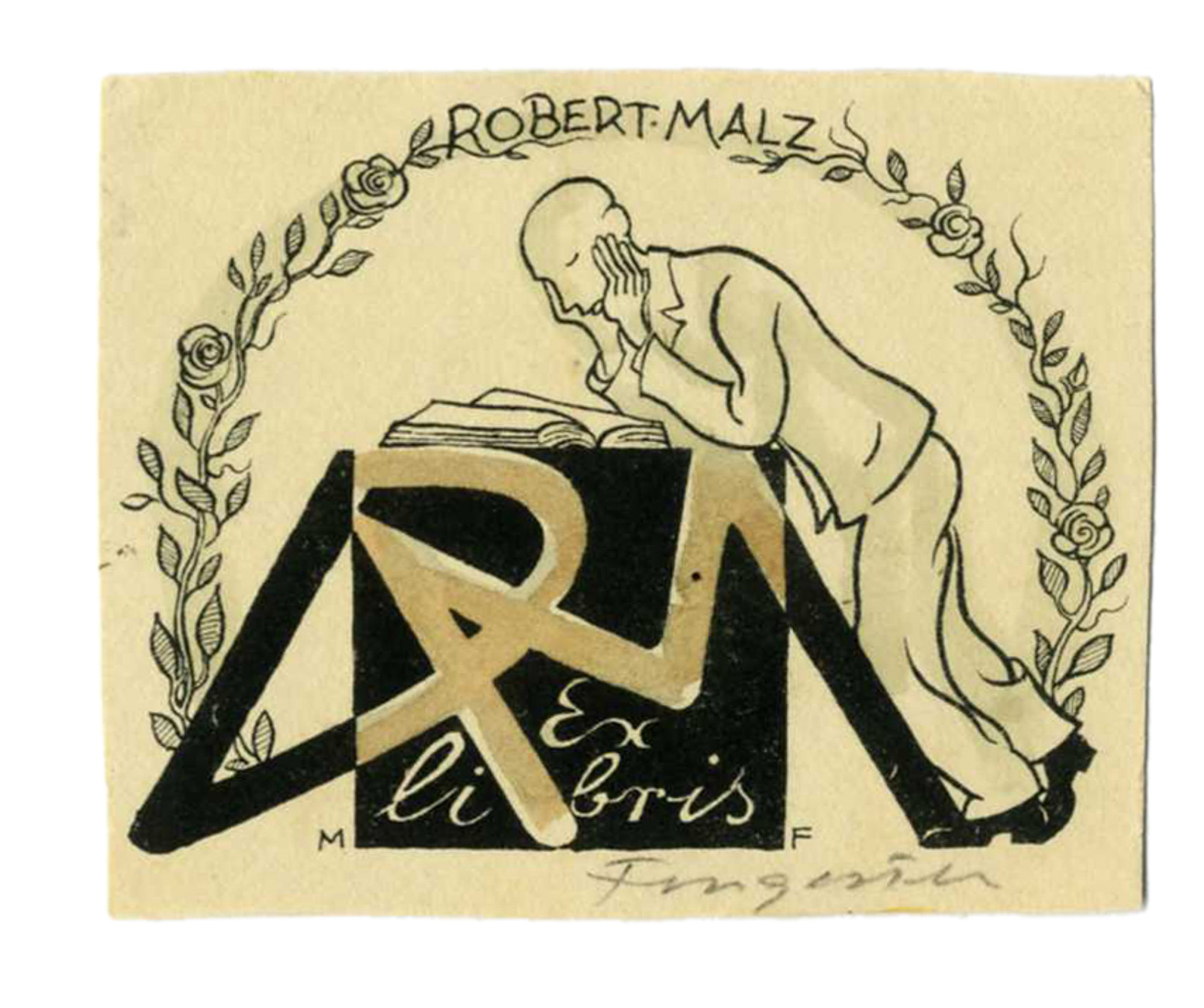 Michel Fingesten, Lotto composto di 4 ex libris. 1) Ex libris Istvan Traurig. Acquaforte. mm 120x50. Foglio: mm 157x65. KATALOG 14 MICHEL FINGESTEN EXLIBRISKUNST, 195. Esemplare tagliato entro l'impronta della lastra. Timbro dell'artista e timbro "Bolaffi Milano 14" al verso. 2) Talbot W. Doctor Juris ex libris. Acquaforte. mm 100x54. Foglio: mm 155x110. DEEKEN, 659. Firma a matita in basso a destra. 3) Ex libris Robert Malz. Litografia a colori. mm 45x60. Foglio: mm 50x63. Firmata a matita in basso a destra, siglata in lastra. 4) Jean Searight ex libris. Acquaforte. mm 60x40. Foglio: mm 115x80. Firmata a matita in basso a destra. Timbro dell'artista al verso. (4)
