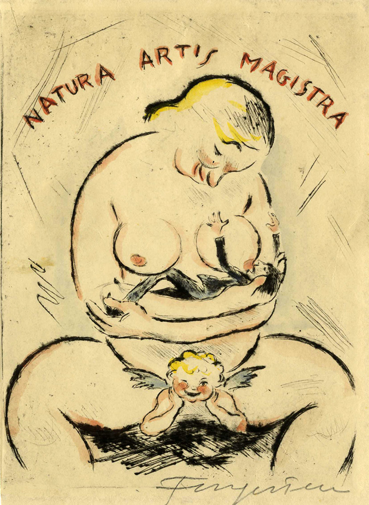 Michel Fingesten, Natura artis magistra. 1922. Puntasecca colorata a mano. mm 183x140. Foglio: mm 195x142. MIRABELLA-BARDAZZI-BALLERINI, 106. Firmata a matita in basso a destra, titolata in lastra al margine superiore. Una delle dieci puntesecche della serie Der klingende Garten, dove viene esplorata la tematica del nudo unita alla musica. (1)
