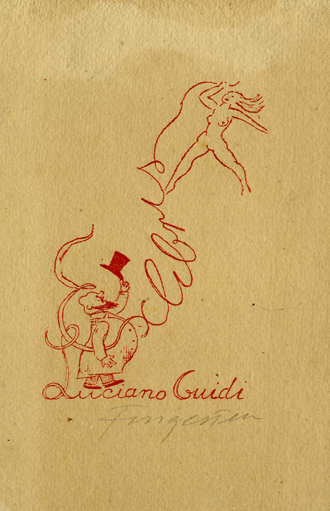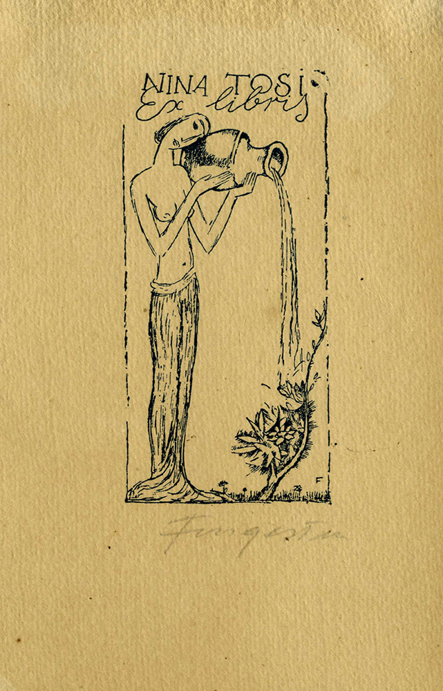 Michel Fingesten, Lotto composto di 5 ex libris. 1936. 1) Mantero. Acquatinta. mm 117x99. Foglio: mm 134x109. TOMASETIG, p. 35. Firma a matita in basso a destra. 2) Luciano Giudi. Litografia. mm 103x73. Foglio: mm 170x110. DEEKEN, 227. Firma a matita in basso a destra. 3) Nina Tosi. Litografia. mm 104x50. Foglio: mm 171x111. DEEKEN, 165. Firma a matita in basso a destra, sigla in lastra in basso a destra. 4) R. A. Litografia. mm 104x70. Foglio: mm 170x111. KATALOG 14 MICHEL FINGESTEN EXLIBRIS KUNST, 35. Firma a matita in basso a destra, siglata in lastra in basso a destra. 5) Prosit. 1936. Litografia. mm 90x86. Foglio mm 100x92. Firma a matita in basso a destra. (5)