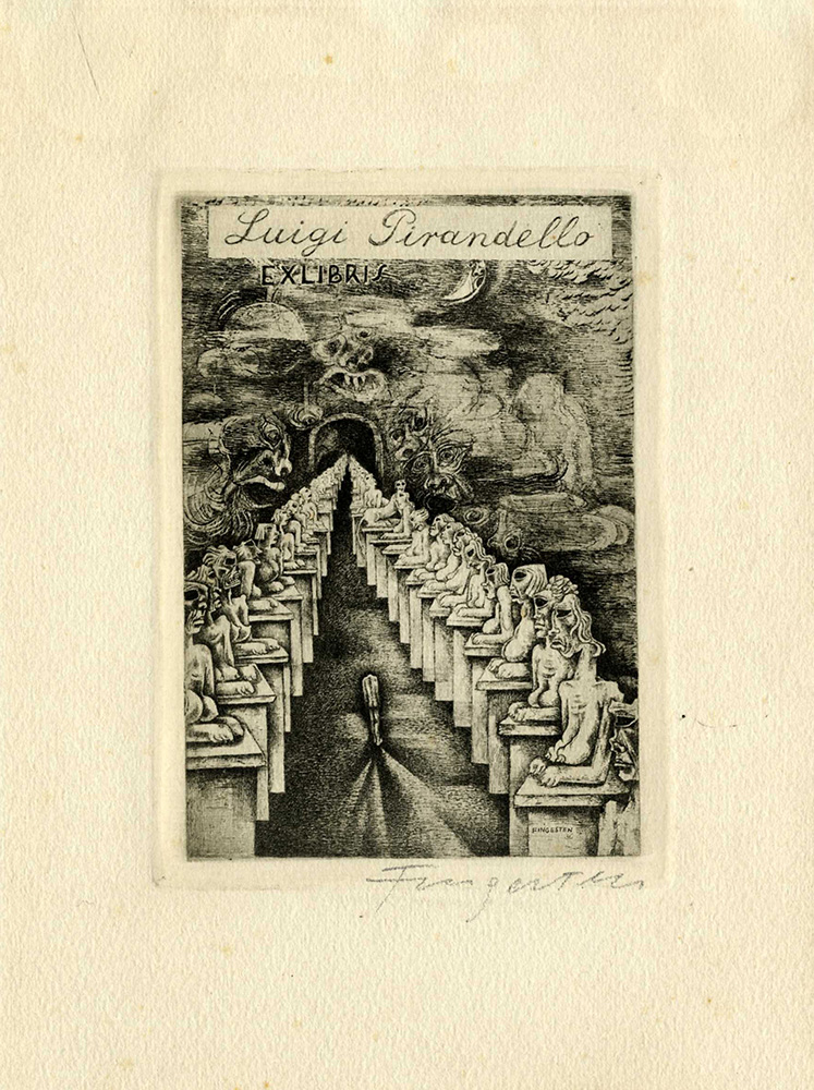 Michel Fingesten, Lotto composto di 2 ex libris. 1936. 1) Gabriele d'Annunzio. Acquaforte. mm 163x110. Foglio: mm 230x186. MIRABELLA-BARDAZZI-BALLERINI, 377. Firmata a matita in basso a destra. monogrammata e datata in lastra in basso a destra. 2) Luigi Pirandello. Acquaforte. mm 130x90. Foglio: mm 205x155. NECHWATAL, P. 87. Firmata a matita in basso a destra, controfirmata in lastra in basso a destra. (2)