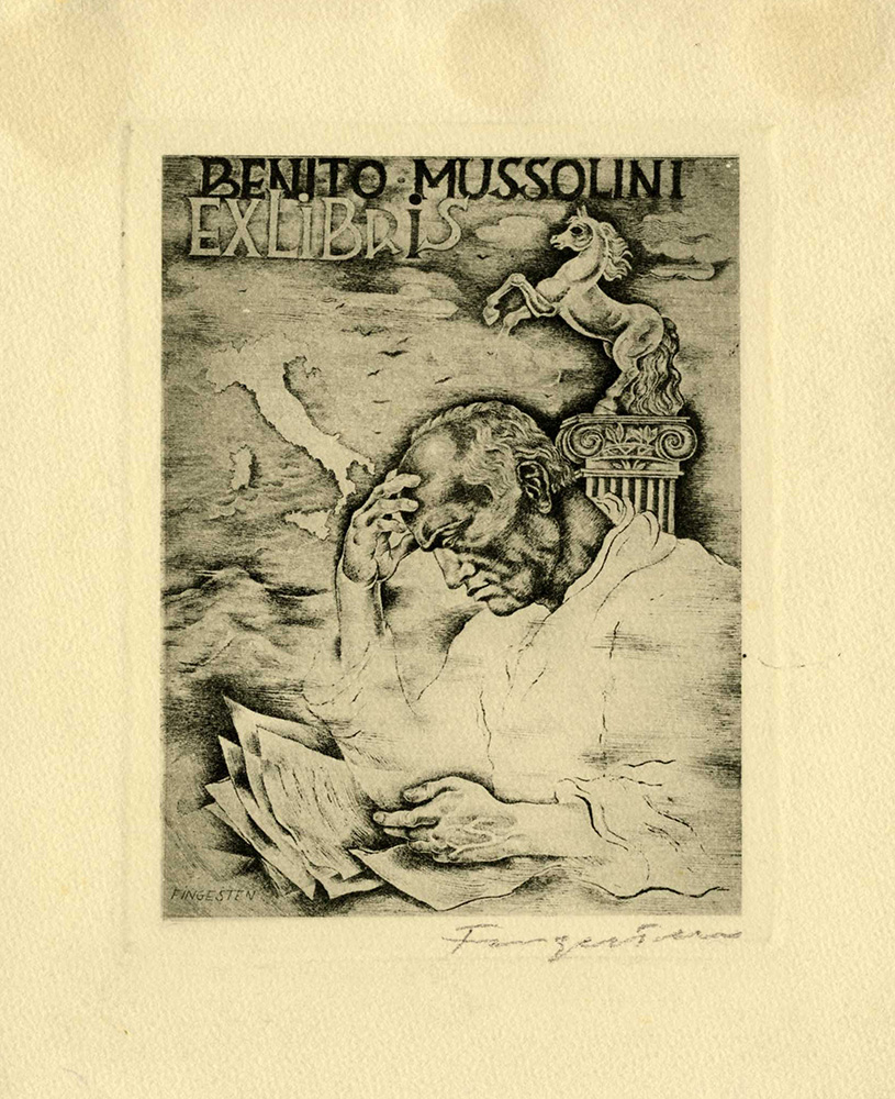 Michel Fingesten, Lotto composto di 2 ex libris. 1936. 1) Benito Mussolini. Acquaforte. mm 130x105. Foglio: mm 180x148. MIRABELLA-BARDAZZI-BALLERINI, 379. Firmata a matita in basso a destra, controfirmata in lastra in basso a sinistra. 2) Gabriele d'Annunzio. Acquaforte. mm 155x111. Foglio: mm 205x155. MIRABELLA-BARDAZZI-BALLERINI, 377. Firmata a matita in basso a destra, siglata e datata "1936" in lastra in basso a destra. (2)