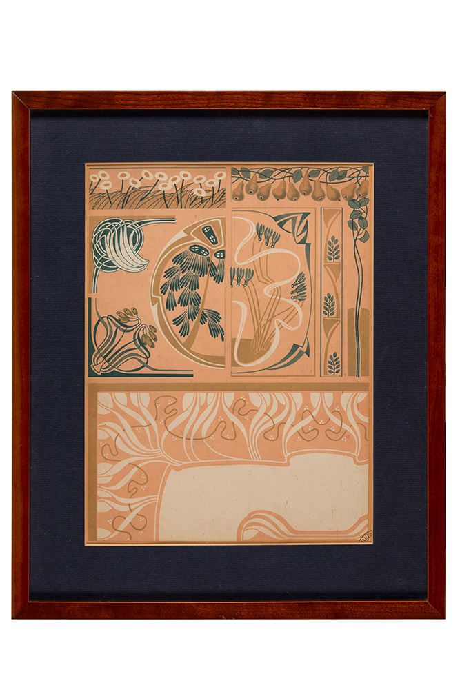 Anonimo liberty, Interno (Rosa, verde e oro) Litografia. mm 325x245 (visibili). Timbro non totalmente leggibile in basso a destra. (1)