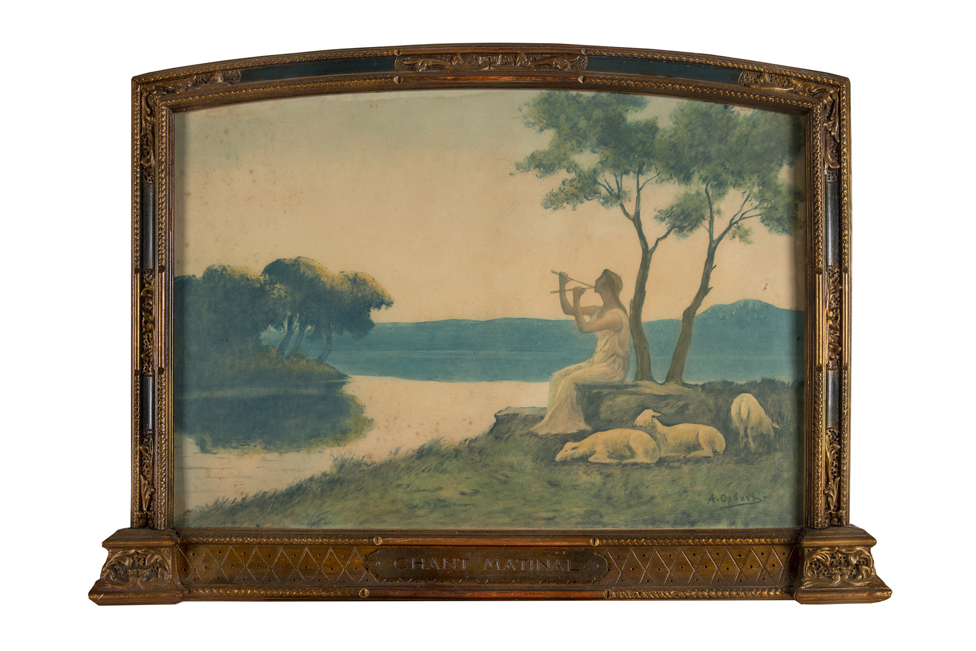 Alphonse Osbert, Chant matinal. 1900 ca. Acquatinta a colori. mm 385x555. Firmata nella lastra in basso a destra. Nella sua cornice originale con il titolo inciso su targhetta metallica in basso al centro come all'epoca erano commercializzate le stampe di Osbert. Pubblicata in La vergine e la femme fatale. L'eterno femminino nell'immaginario grafico del Simbolismo e dell'Art Nouveau, a cura di Emanuele Bardazzi, catalogo della mostra, Sesto Fiorentino 2017, p. 166, n. 229. (1)