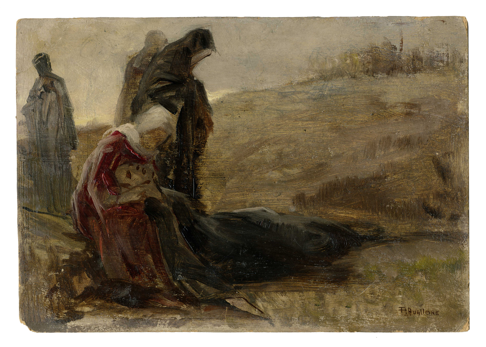 Pasquale Avallone, Dittico. 1) Cristo nell'orto. Olio su cartone. cm 24x34. Firmata in basso a destra. Al verso controfirma, titolo ed accenno di studio pittorico. 2) Le Marie al calvario. Olio su cartone. cm 24x34. Firmata in basso a destra, controfirmata e titolata al verso.