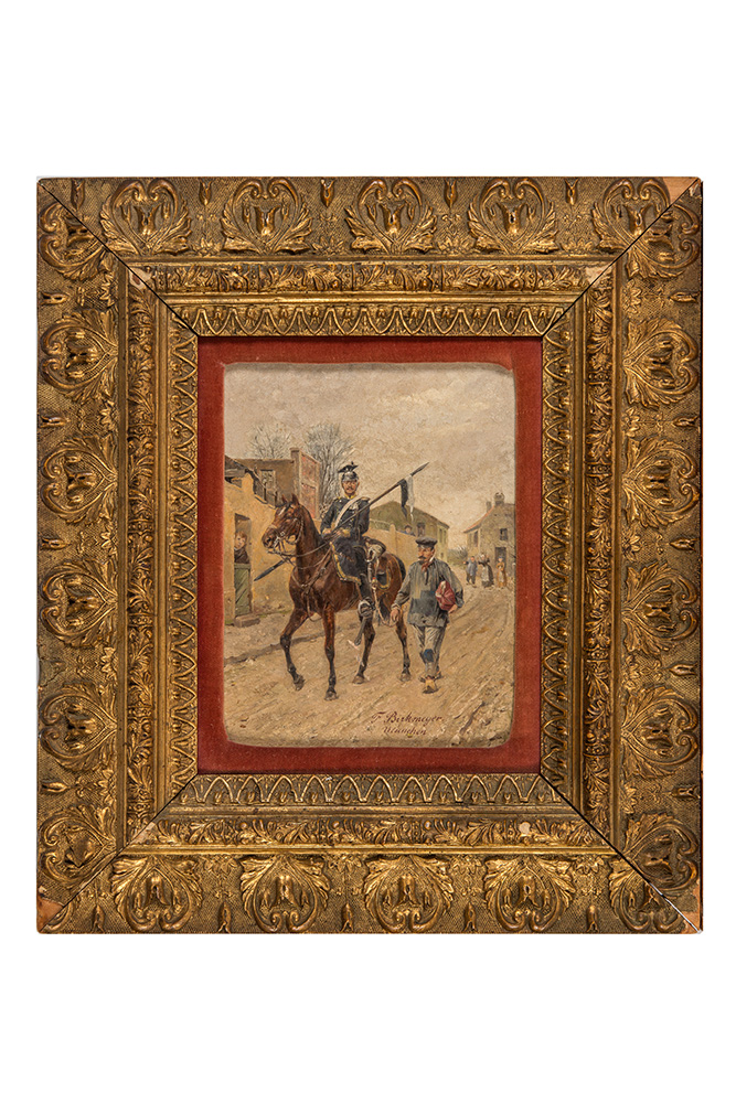 Fritz Birkmeyer, La marcia. Tempera su tavola. cm 23x18. Firmato in basso al centro e sotto iscritto: "Munchen". Al verso targhetta: "Winsor&Newton (Limited), artists' colourmen to Her Majesty, T.R.H. the Prince and Princess of Wales, 38, Rathbone Place, W. and North London colour works, Kentish Town, N. W.". (1)