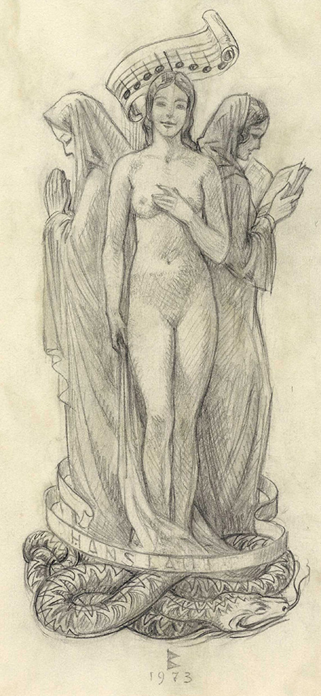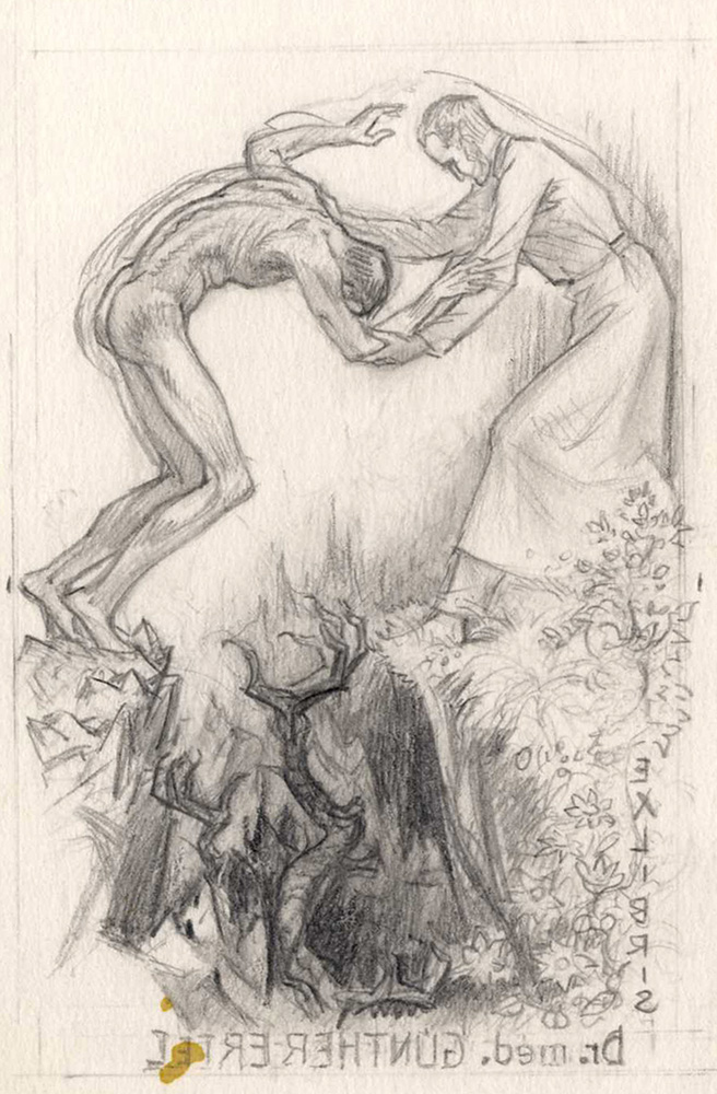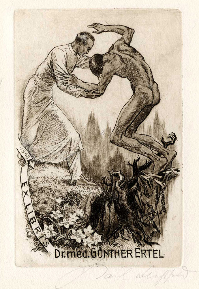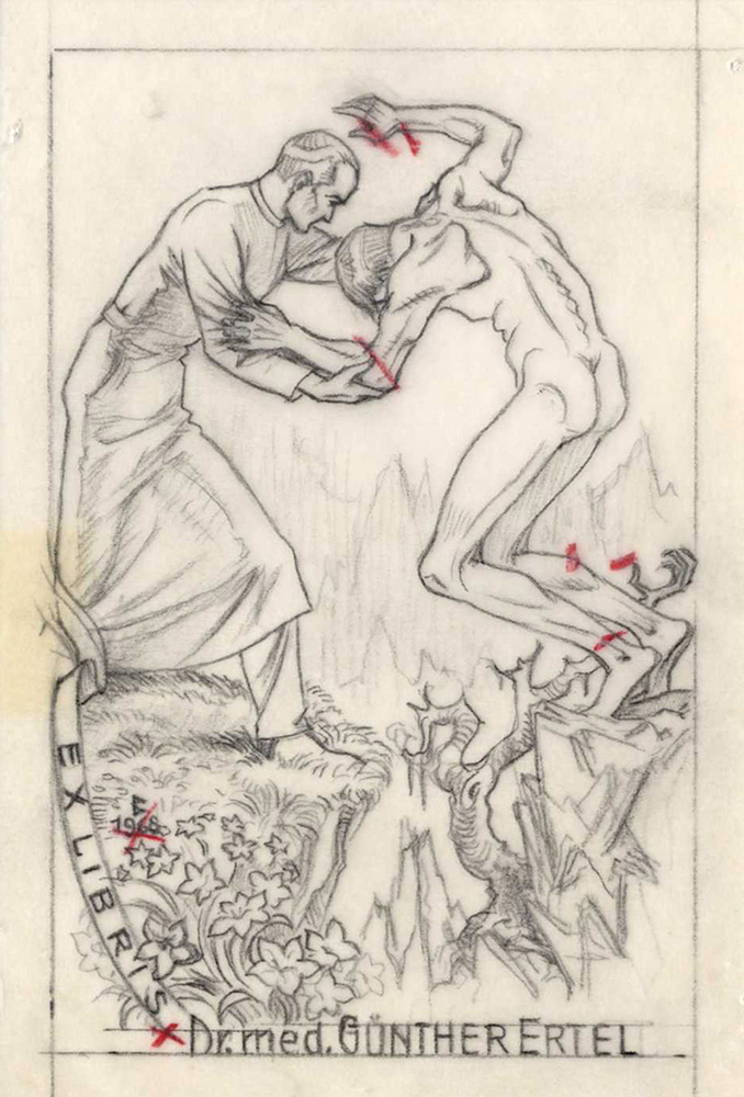 Karl Blossfeldt, Lotto composto di 4 disegni e 1 ex libris. Raccolta di 3 disegni preparatori a matita per ex libris. mm 140/147x98/107. Tutte con timbro dell'artista in basso a sinistra. SI AGGIUNGONO: 1) Id., Ex libris Dr. mes. Gunther Ertel. Acquaforte. mm 115x72. Foglio: mm 200x150. Firmato a matita in basso a destra, timbro dell'artista al verso. Incisione finale dei disegni preparatori descritti precedentemente. 2) Anonimo del XX secolo, Senza titolo. Matita su carta applicata a cartone. mm 280x212. Monogrammato e datato 1973 al margine inferiore. (5)