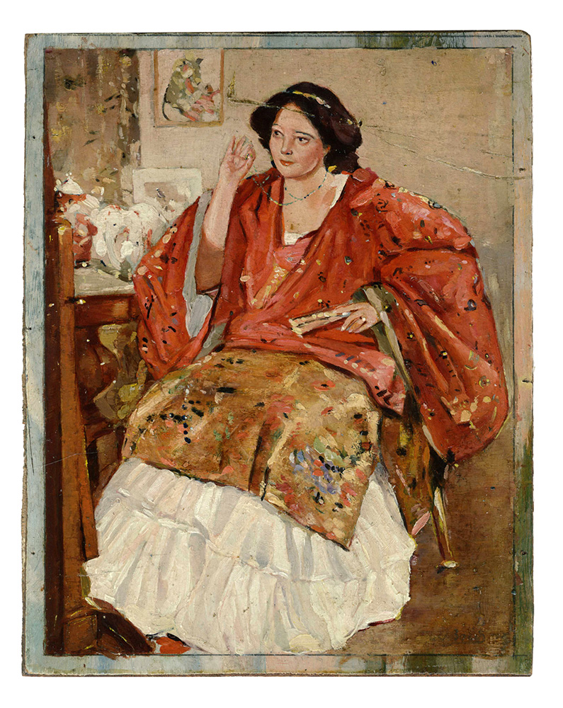Eduard Boss, Donna in rosso. 1936. Olio su tavola. cm 25x20. Nome dell'artista e data iscritti al verso a matita. (1)