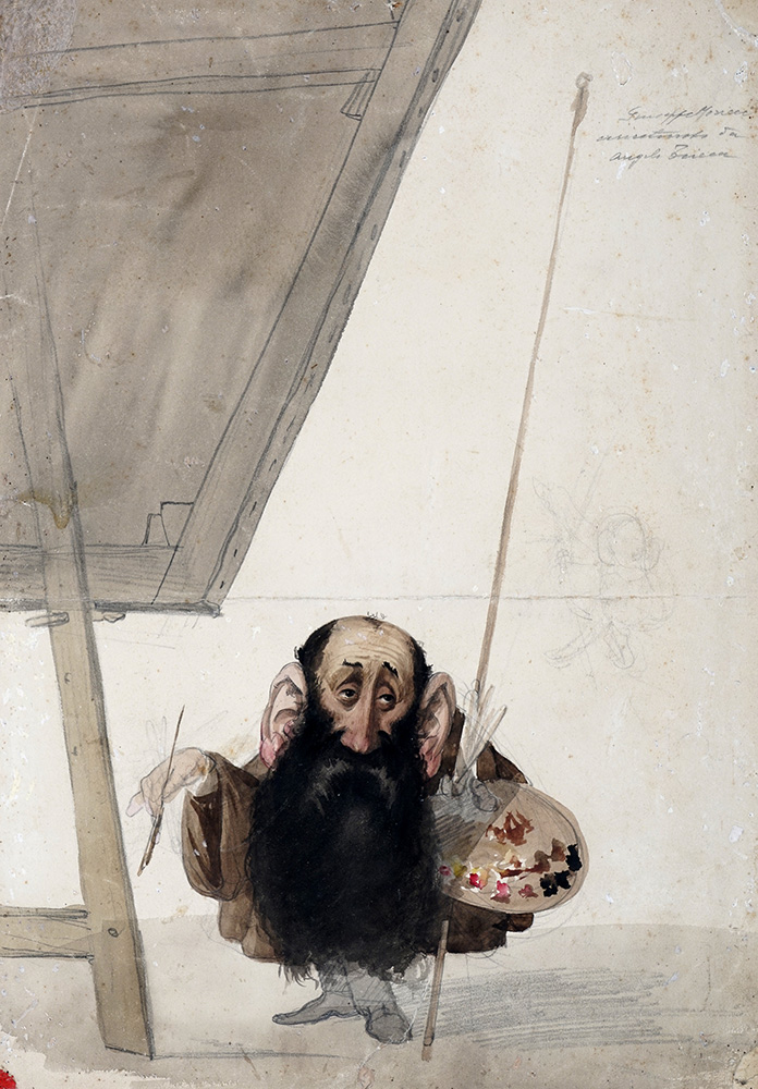 Angelo Tricca, Il pittore Moricci al cavalletto. Acquerello e matita su carta. mm 362x254. Iscritto a matita in alto a destra: "Giuseppe Moricci caricaturato da Angelo Tricca". Meravigliosa opera esposta alla mostra Tricca caricaturista. Caricaturisti e caricaturati al Caffè Michelangiolo di Arezzo alla Galleria Comunale d'Arte Contemporanea, dal 25 agosto al 25 settembre 1966, di cui riporta il timbro al verso. L'opera è anche la copertina del catalogo della relativa mostra. L'acquerello è accompagnato da una copia del catalogo stesso. (1)