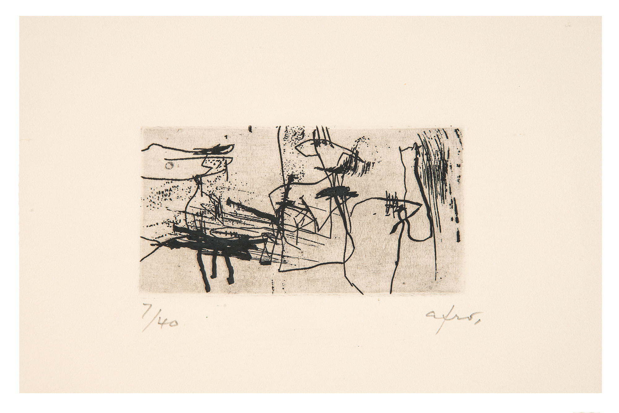 Afro Basaldella, Senza titolo. Seconda metà del XX secolo. Acquaforte. mm 75x150. Foglio: mm 350x490. Firma a matita in basso a destra e tiratura in basso a sinistra. Timbro a secco in basso a sinistra. Es. 7/40. (1)