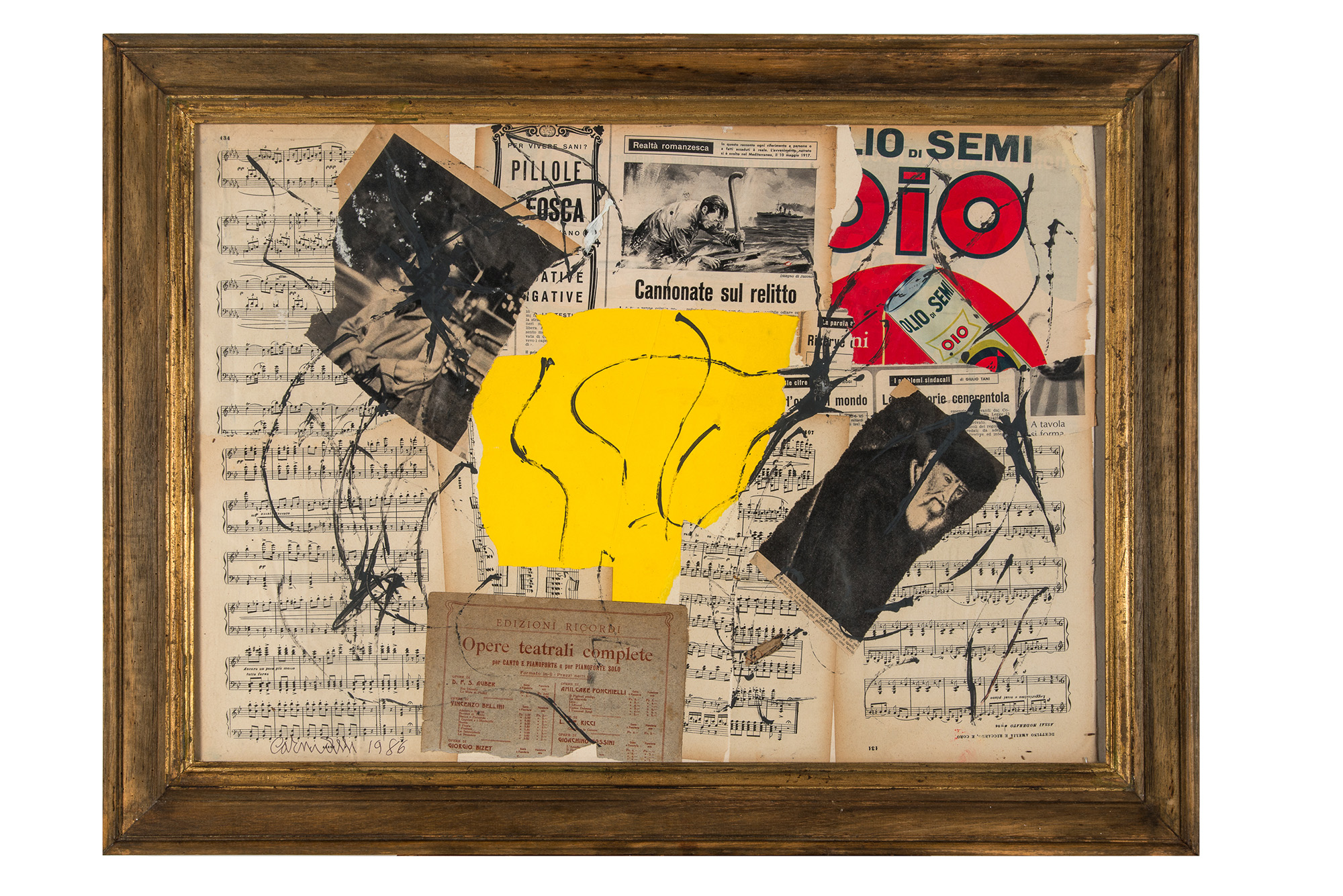 Arturo Carmassi, Senza titolo. Anni '80 del XX secolo. Collage e acrilico. cm 50x70. Opera accompagnata dal certificato di autenticità su fotografia dell'artista stesso. (1)