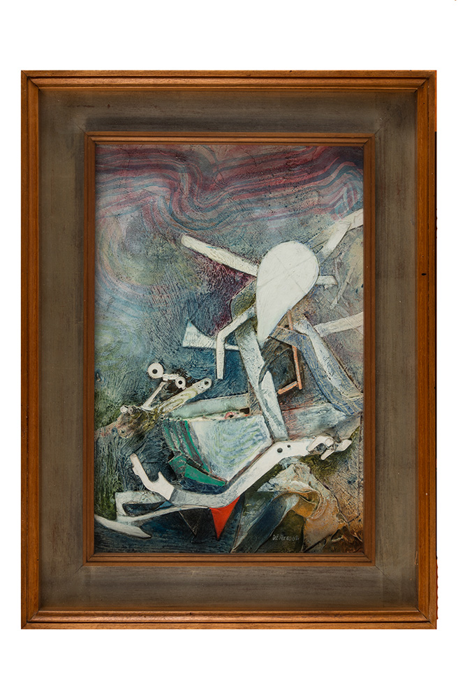 Lucio Del Pezzo, Meccano. 1962. Olio, stucco, tempera, rondelle e parti metalliche su cartone. cm 40,5x27. Firmato e datato in basso a destra, controfirmato, controdatato e titolato al verso. Opera rara, sul mercato non sono presenti molte opere dei primi anni Sessanta. Allievo di Emilio Notte all'Accademia di Napoli, l'artista è stato tra i fondatori del Gruppo 58 di Napoli, d'impostazione neosurrealista e neodadaista. A partire dal 1962, Del Pezzo ha realizzato un suo tipico repertorio di "quadri" o "sculture" (spesso di impossibile definizione, proprio perchè unisce le due tecniche), formati da pannelli geometrici monocromi, sui quali sono inserite mensole o scavate concavità, che sostengono oggetti geometrici regolari (birilli, uova di legno, bocce, manichini, etc.). Nelle sue pitture-oggetto e nei suoi assemblages è sempre presente l'aspetto ludico. Per il tono ironico e per l'utilizzo di oggetti d'uso quotidiano decontestualizzati, tali opere rimandano alla Pop Art; ma si riscontra un evidente recupero di Giorgio De Chirico, Carlo Carrà, Giorgio Morandi e delle geometrie della pittura metafisica. Tra le opere monumentali, ha realizzato i progetti per alcune fermate della metropolitana d'artista a Napoli. (1)