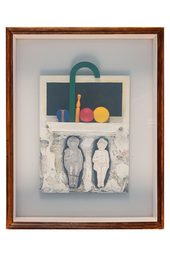 Lucio Del Pezzo, Ex voto di bambini. Stucco, olio e oggetti in legno dipinto su masonite. cm 40x31. Firmato in basso a destra. Al verso controfirmato, titolato e riportate le misure dell'opera e la tecnica artistica. (1)