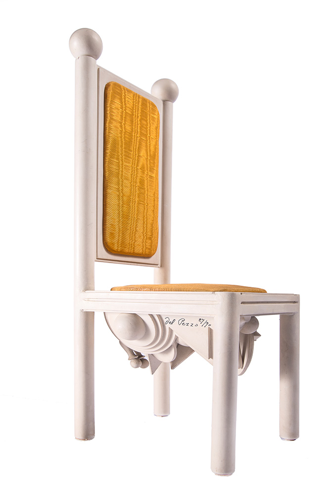 Lucio Del Pezzo, Sedia. 1974. Legno e tessuto. cm 41,5x16x14. Firma e tiratura sotto alla seduta, nella parte sinistra. Es. 27/70. (1)