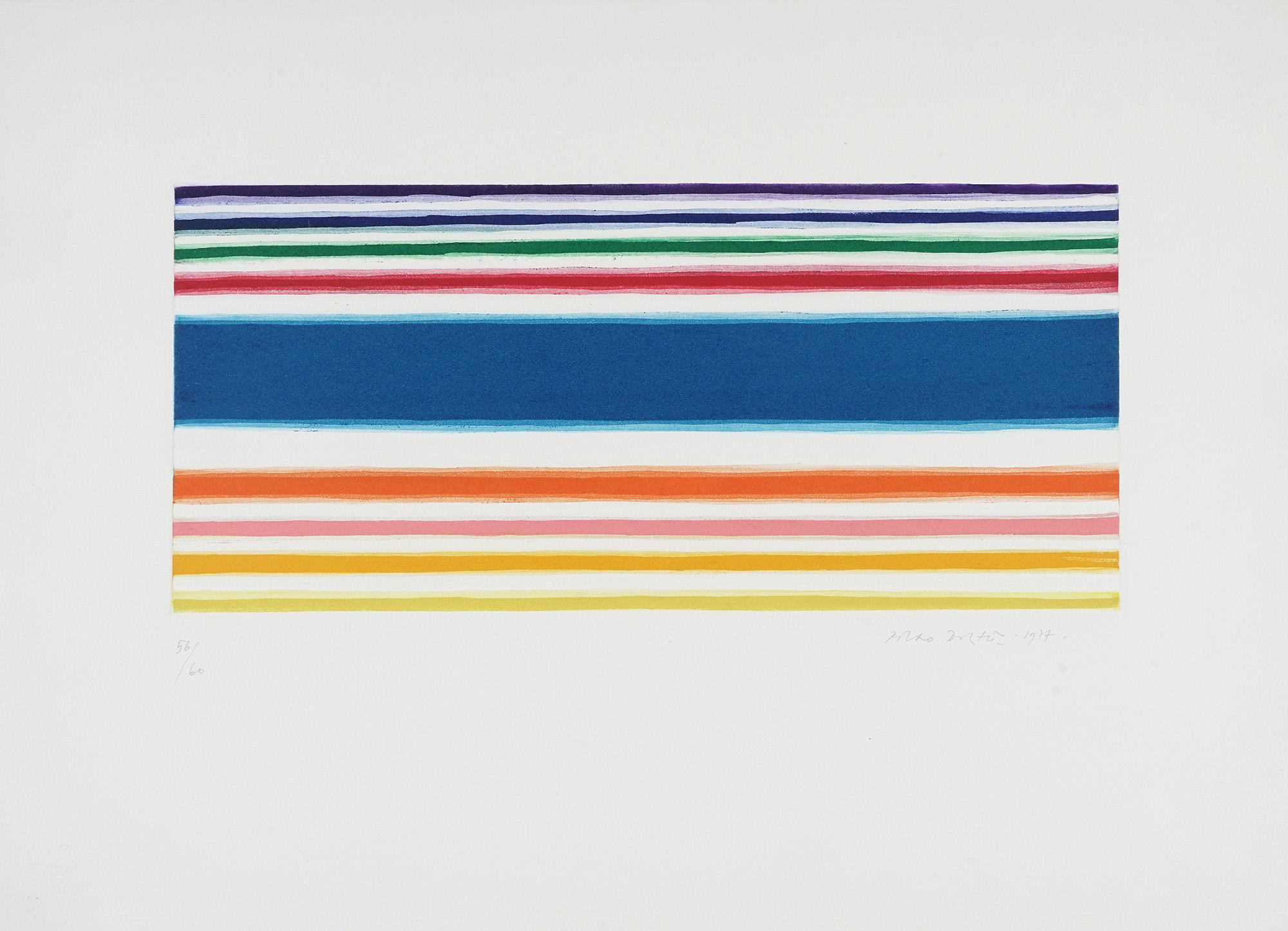 Piero Dorazio, KWYU. 1977. Acquatinta. mm 225x495. Foglio: mm 497x695. simongini, 187. Firmata e datata a matita in basso a destra, numerata in basso a sinistra e, sotto, timbro a secco. Es. 56/60. (1)