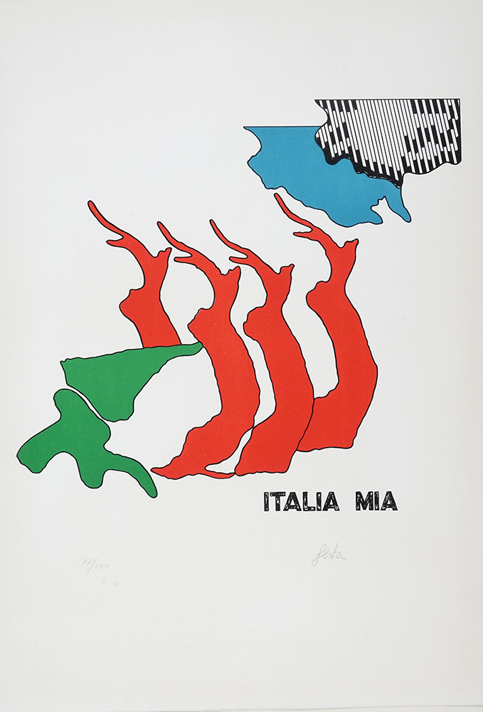 Tano Festa, Lotto composto di 3 incisioni. Anni '60 del XX secolo. Dedicato a; Italia mia; Senza titolo. Litografie. mm 400/456x330/420. Tutte firmate a matita in basso a destra e numerate in basso a sinistra. Due titolate in lastra. Tutte con timbro a secco "Lo Storiele s.p.a." in basso a sinistra. Es. 2/150, 77/150 e 1/150. (3)