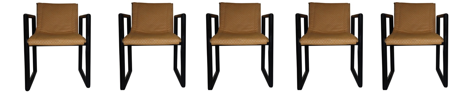 Gruppo di 5 sedie, 80s H cm 74x53 Attribuibili a B&B Italia. Struttura in tondo di legno laccato a poro pieno nei toni del nero. Seduta in tessuto da ricondizionare. Attribuibili a B&B Italia. Struttura in tondo di legno laccato a poro pieno nei toni del nero. Seduta in tessuto da ricondizionare.