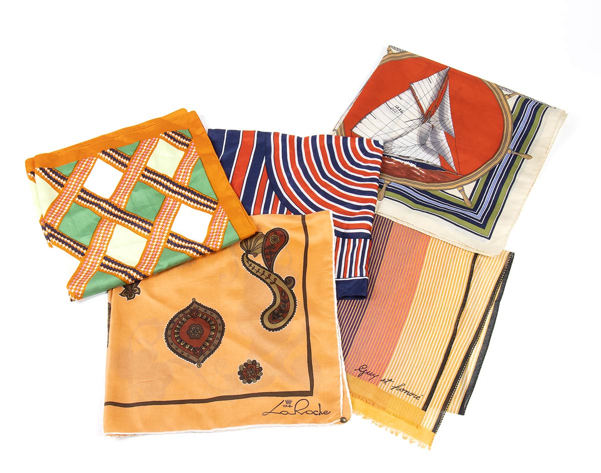 Lotto di 5 foulard anni 70/80, seta e materiali sintetici, grado di condizione generale B/C (segni di utilizzo)