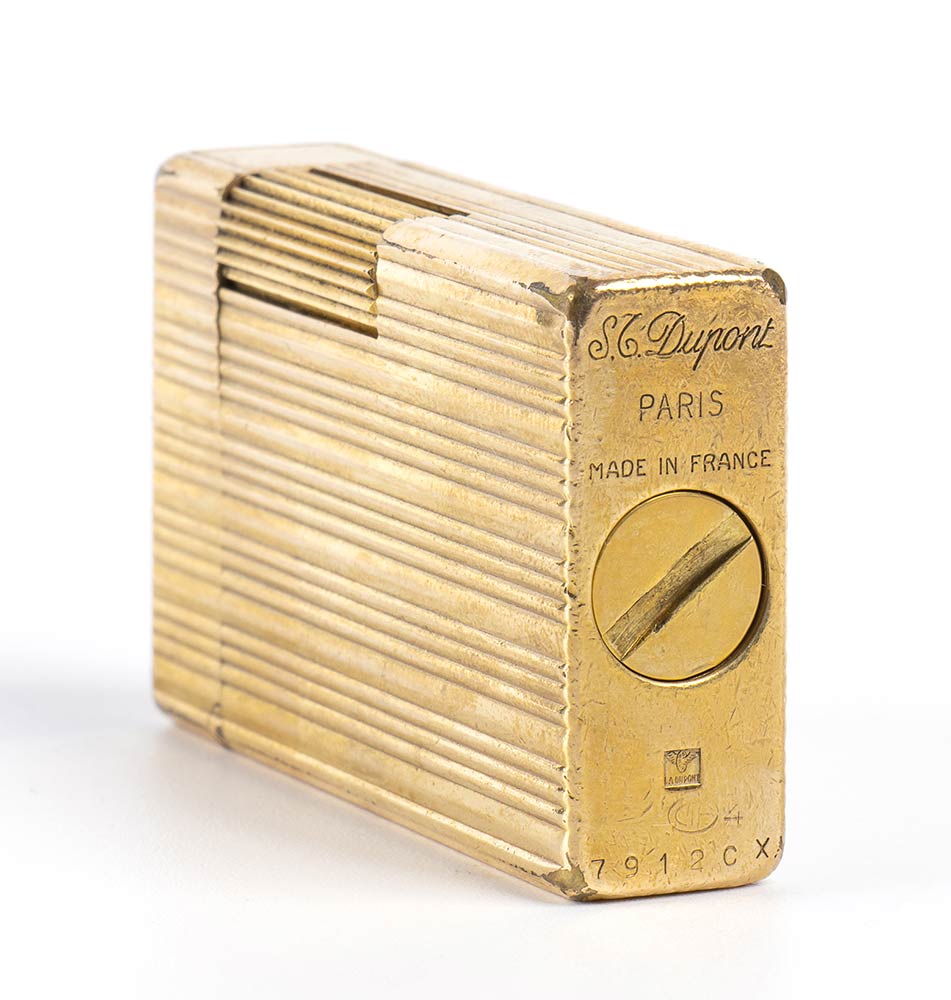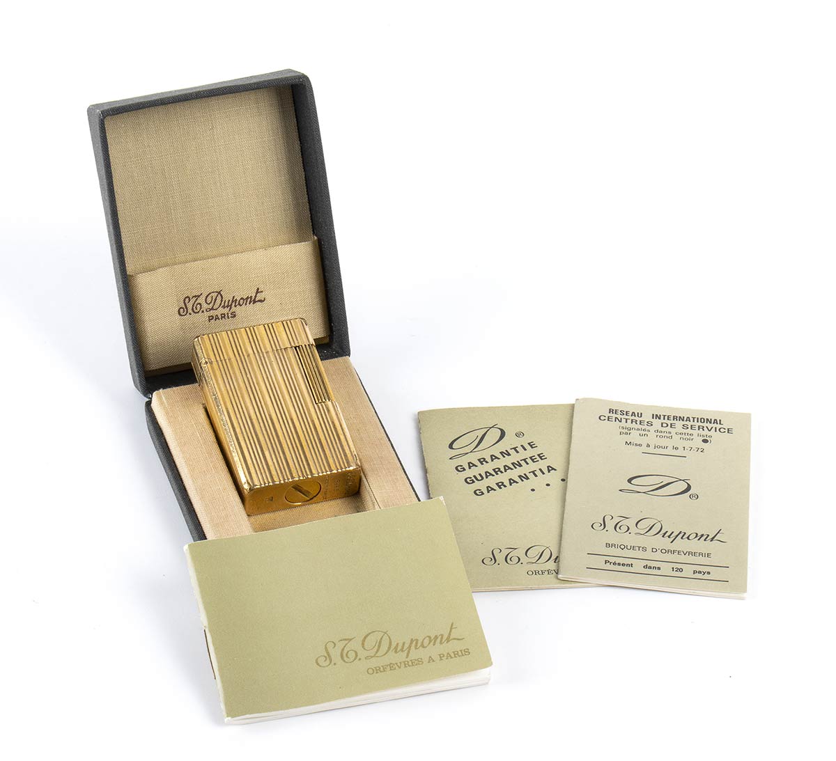 Dupontaccendino Accendino S.T. Dupont fine anni 70 in metallo dorato, scatola originale, grado di condizione generale C/D (segni di utilizzo)