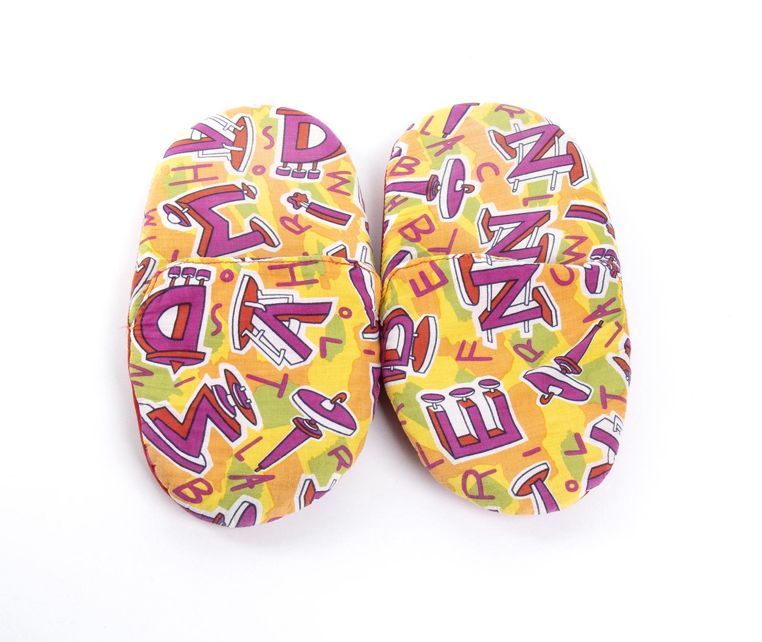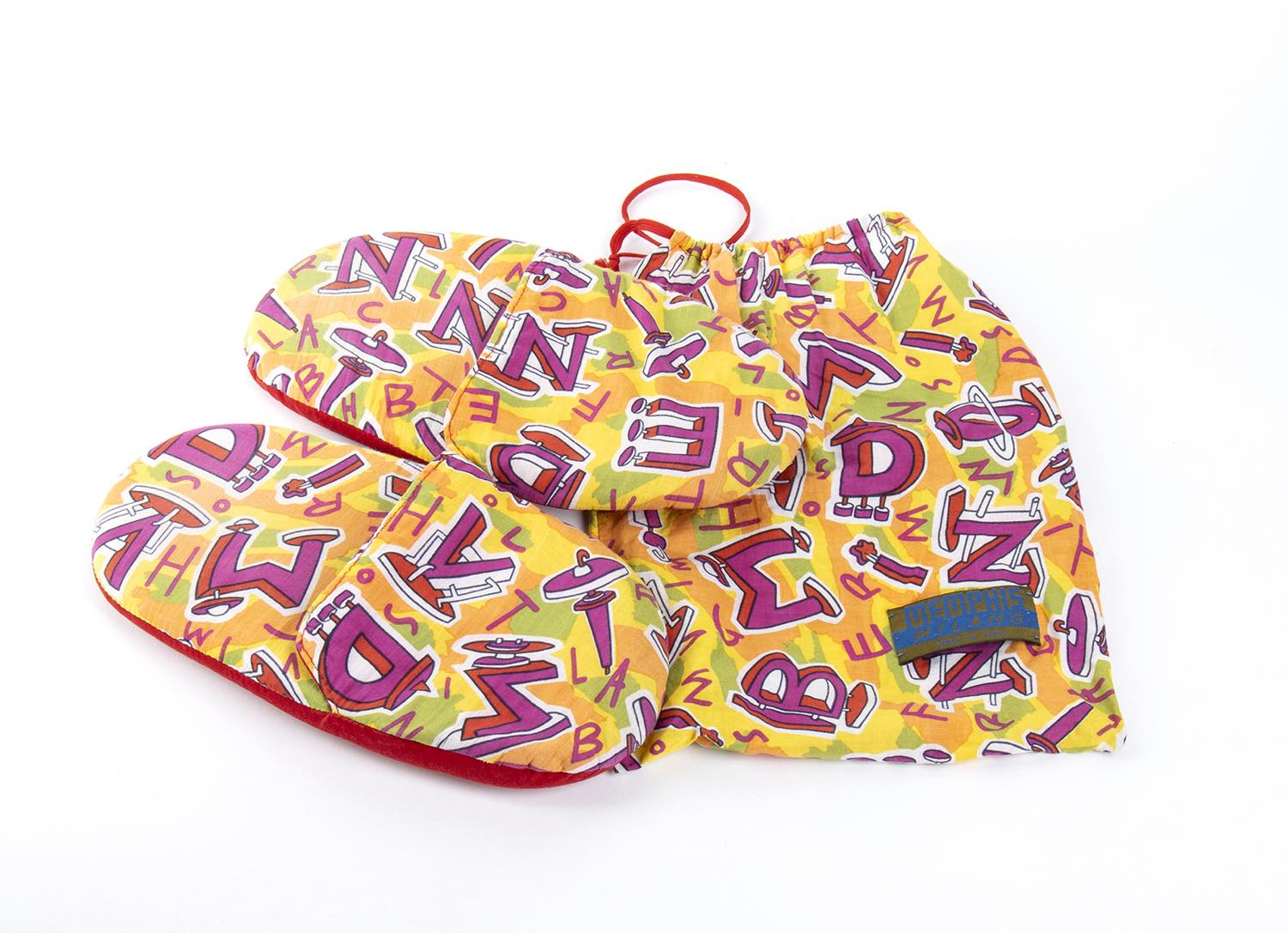 Memphis Milanopantofole da viaggio Paio di pantofole da viaggio anni 80 Memphis Milano, cotone stampato con tipico pattern Memphis, custodia, grado di condizione generale B (leggeri segni di utilizzo)