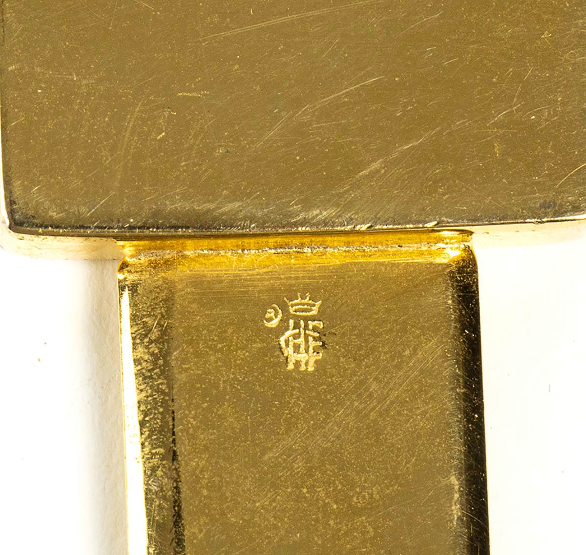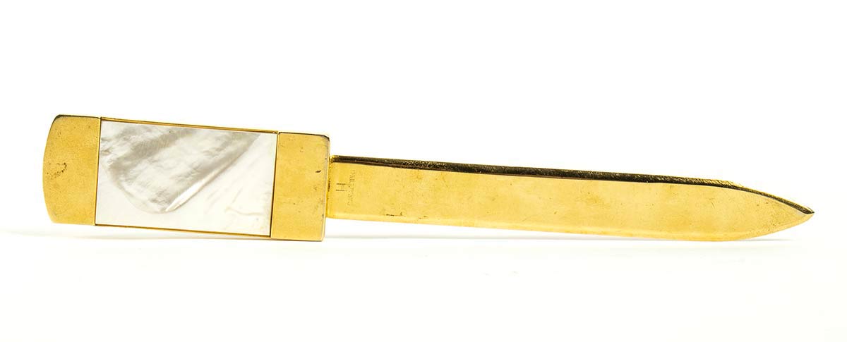 Helietta CaracciolotagliacarteTagliacarte anni 80 Helietta Caracciolo in ottone con placca in finta madreperla, grado di condizione generale C (segni di utilizzo)