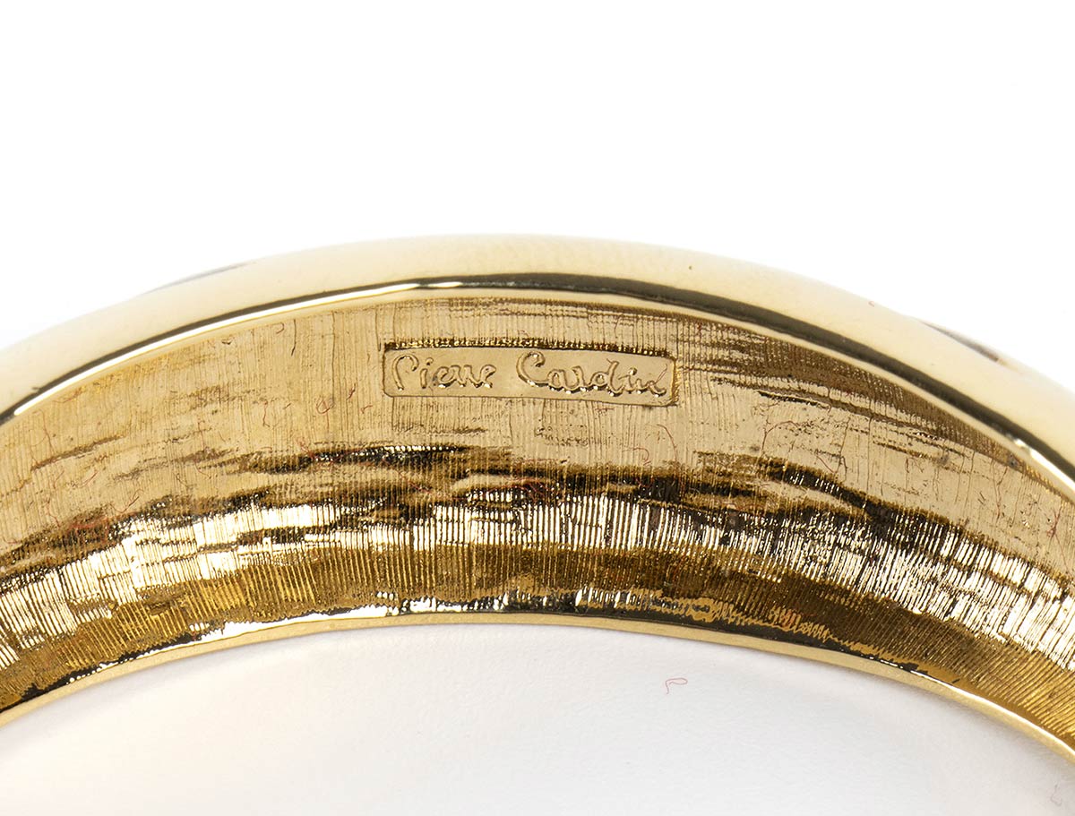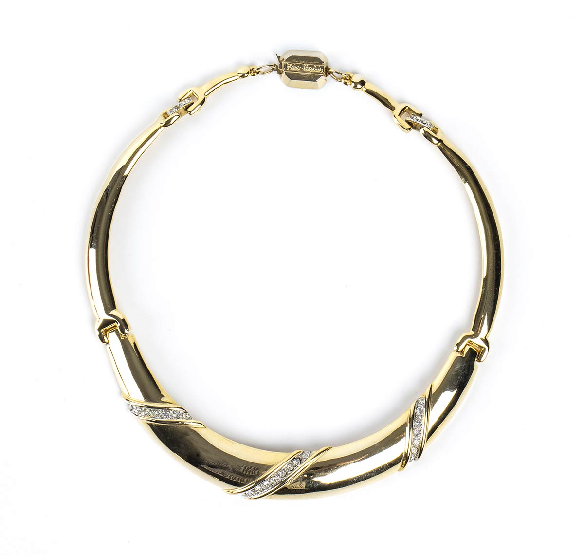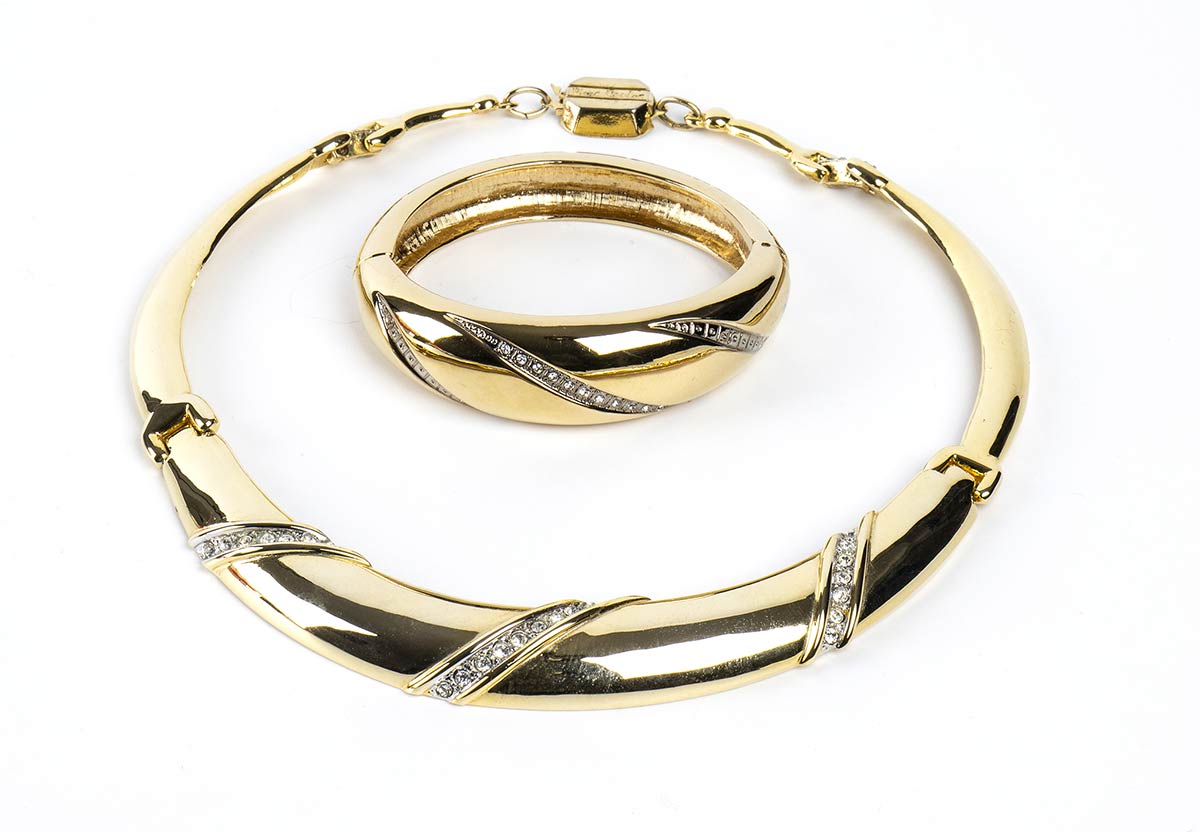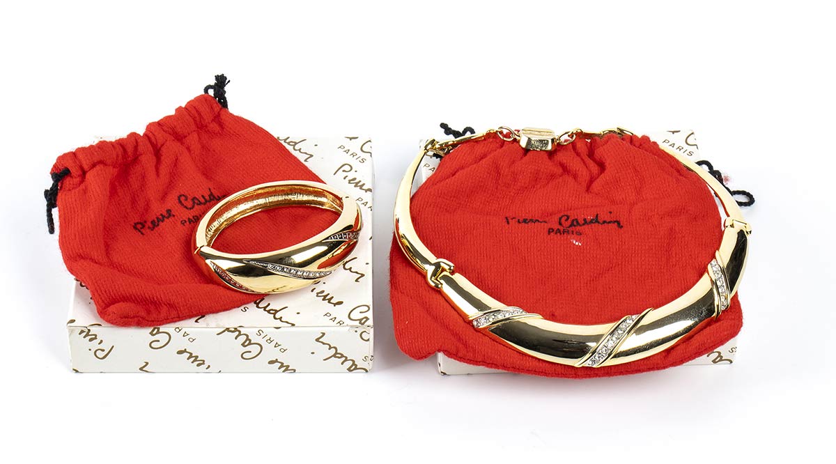 Pierre CardinParure Parure fine anni 80 inizio anni 90 Pierre Cardin in metallo dorato e strass: bracciale rigido e collana, scatole originali, grado di condizione generale B