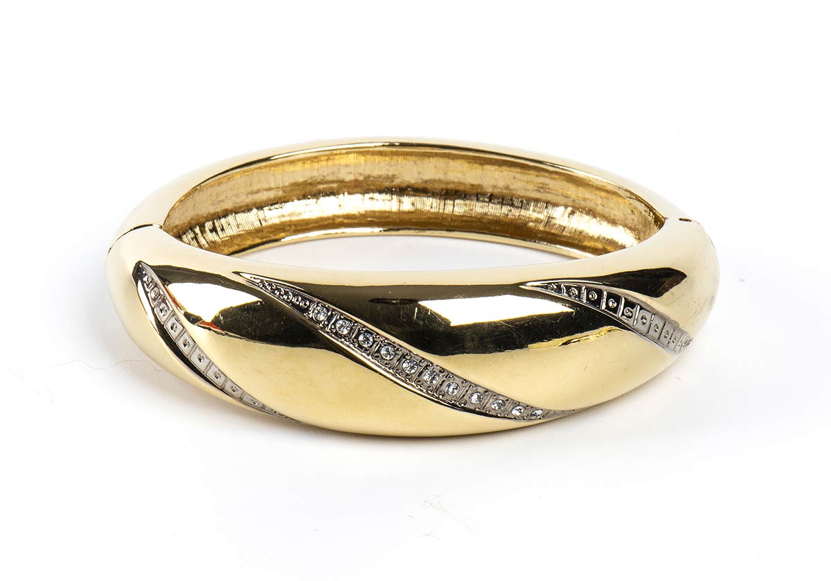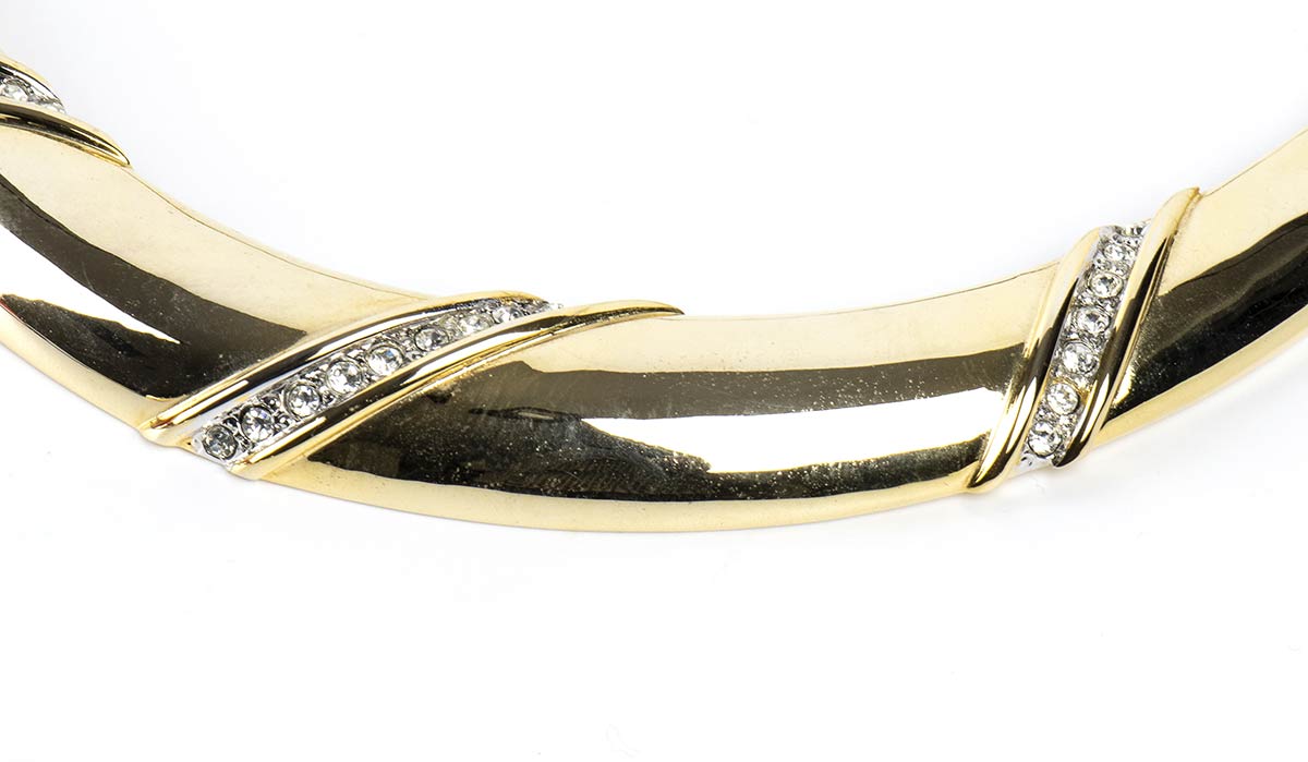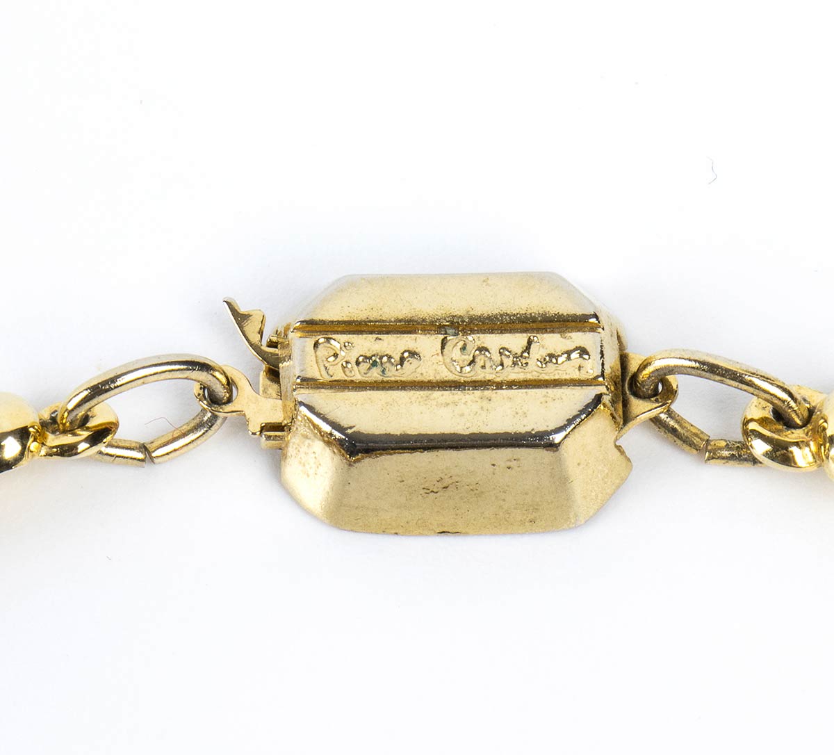 Pierre CardinParure Parure fine anni 80 inizio anni 90 Pierre Cardin in metallo dorato e strass: bracciale rigido e collana, scatole originali, grado di condizione generale B