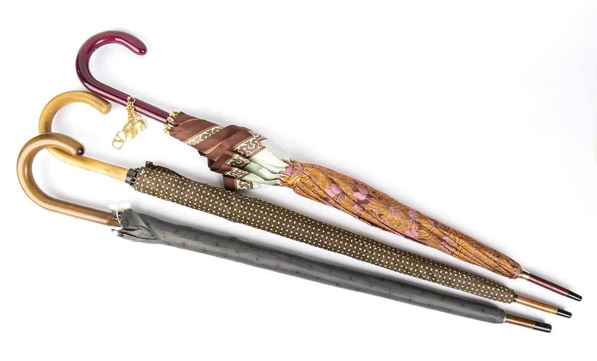 Valentinoombrelli Lotto di 3 ombrelli Valentino anni 90, grado di condizione generale A/B (ombrelli maschili), C (ombrello femminile - tacca nel legno del manico)