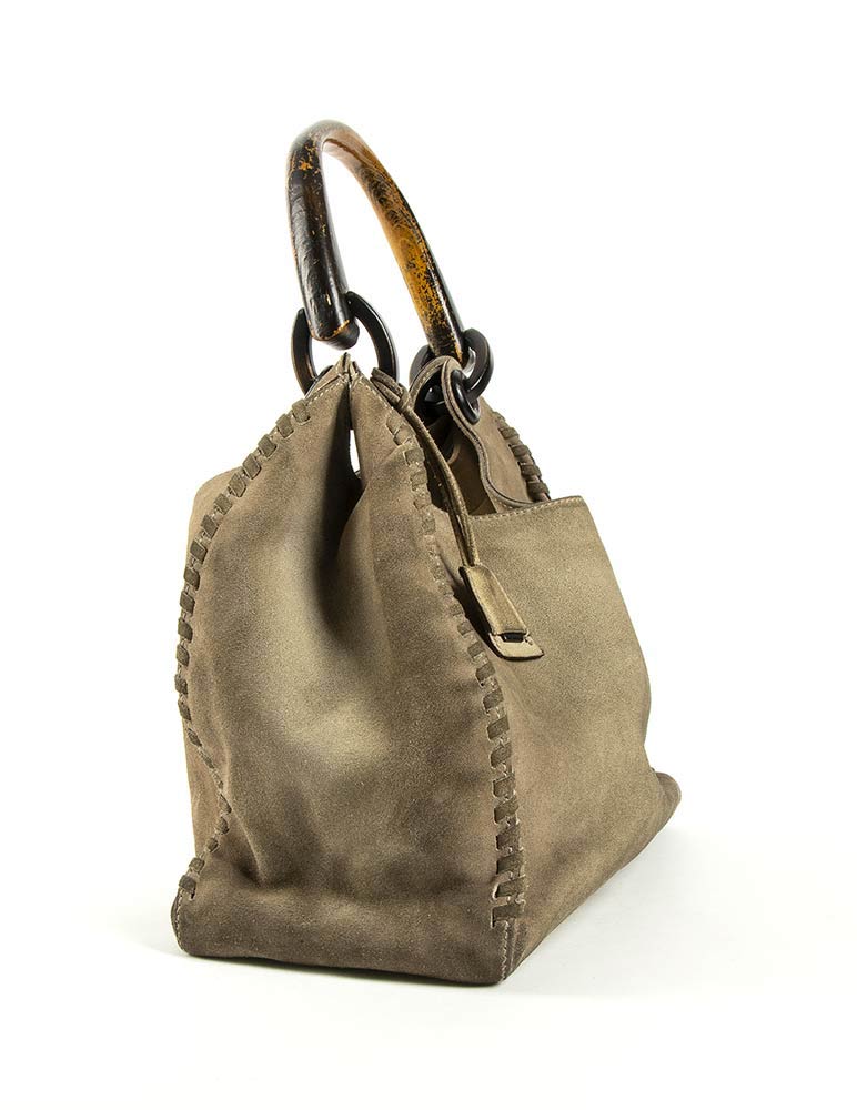 Gucciborsa Borsa Gucci anni 90 in pelle scamosciata color tortora, manico in legno, grado di condizione geneale B