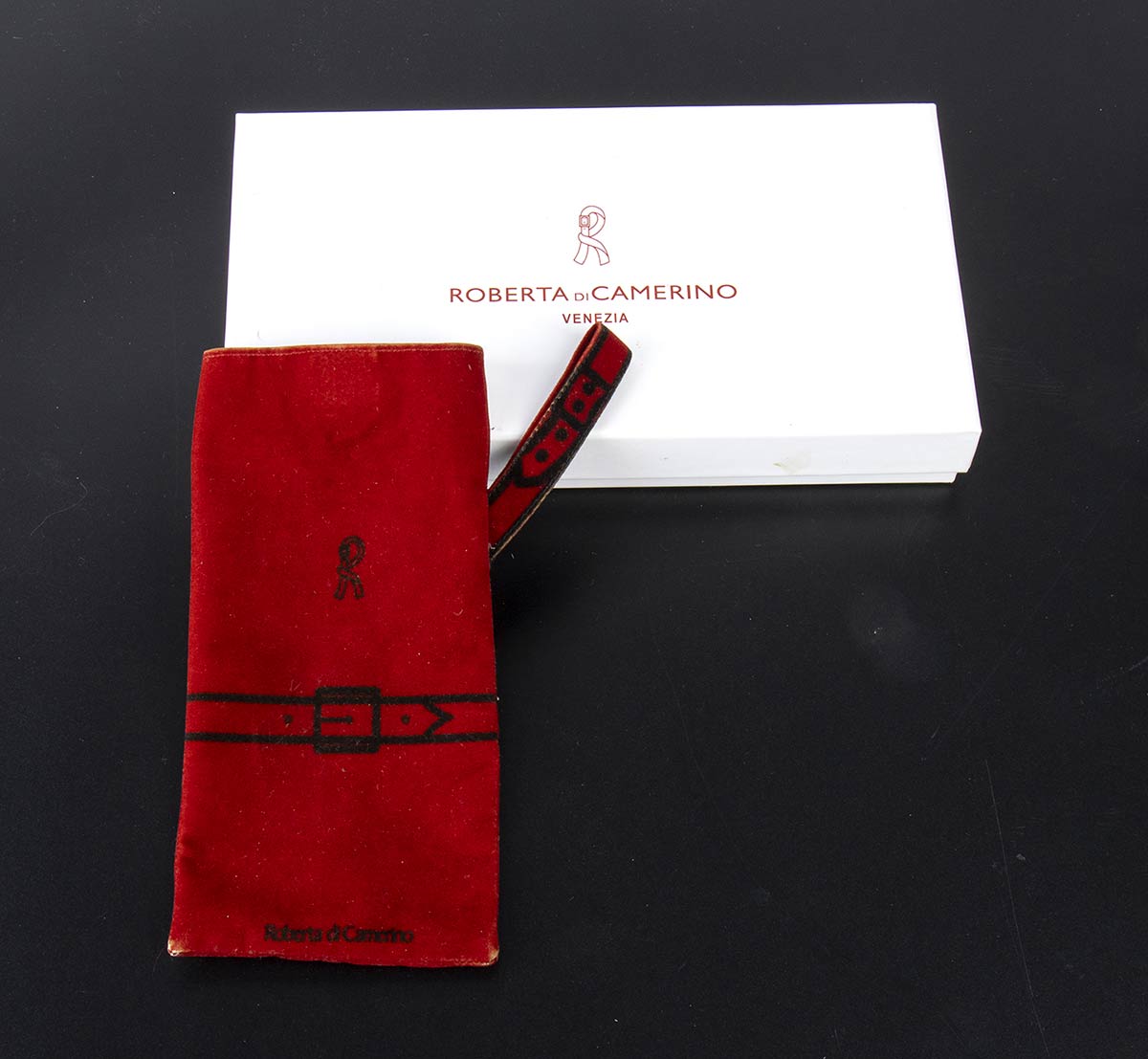 Roberta di Camerinoporta occhiali Porta occhiali in velluto rosso Roberta di Camerino, anni 90, scatola originale, grado di condizione generale B/c (segni di utilizzo)