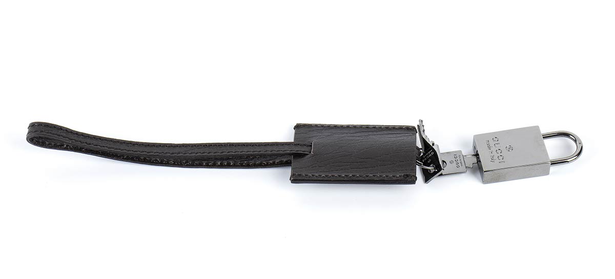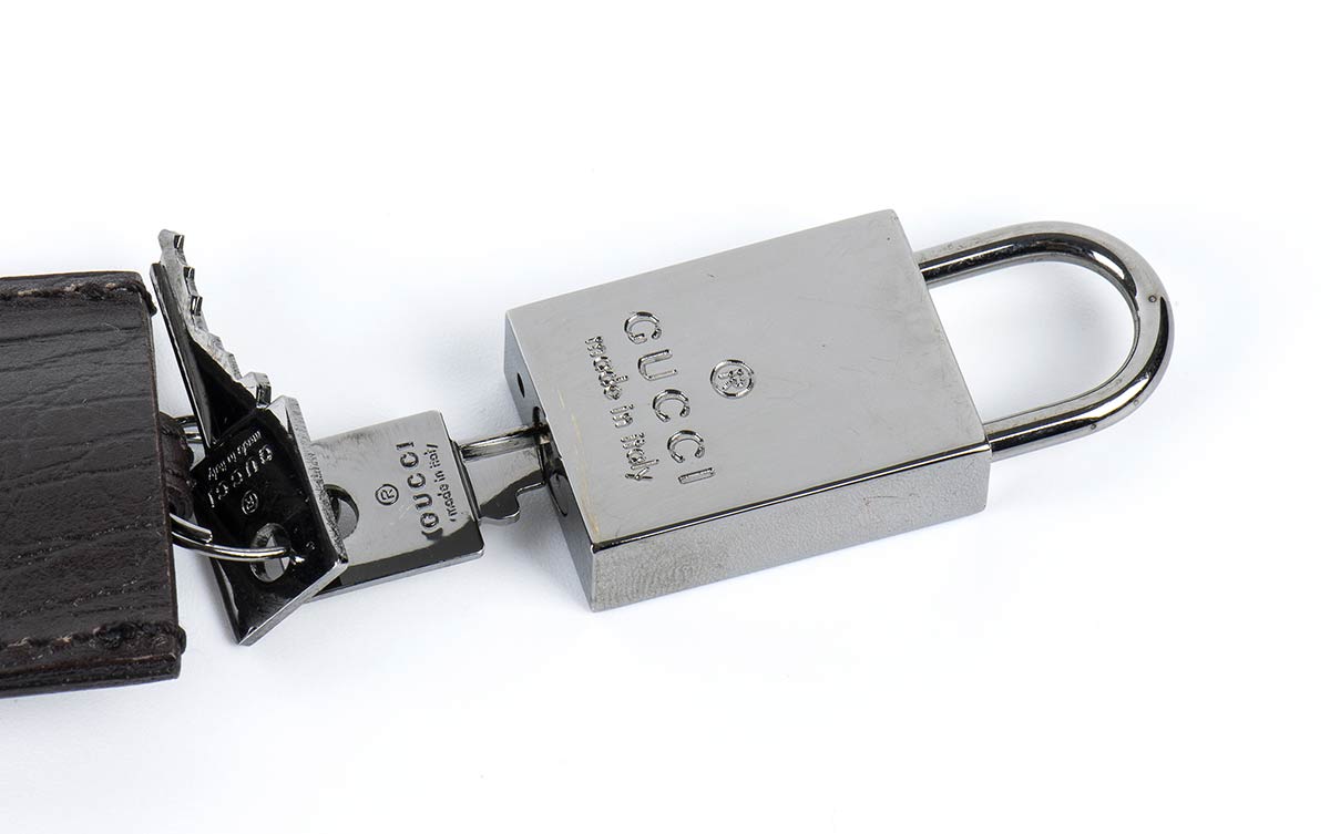 GucciLucchetto e Chiave Gucci anno 2010 ca lucchetto in metallo e chiavi, case in pelle marrone scuro, grado di condizione generale B