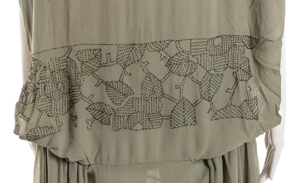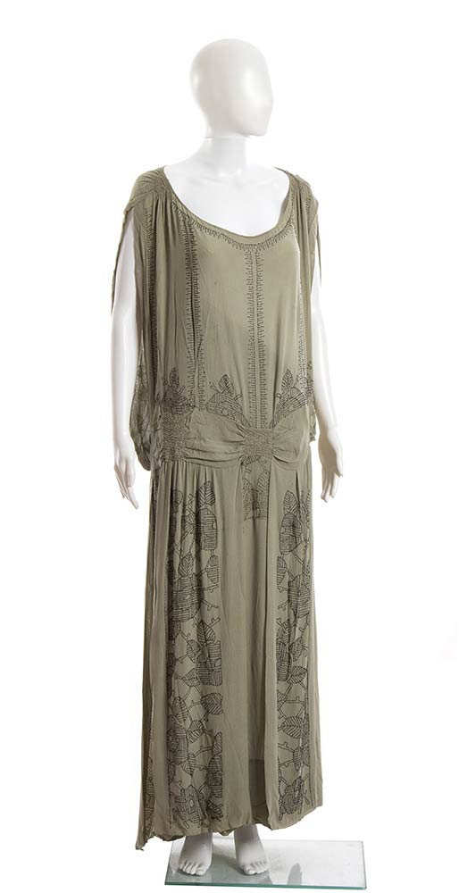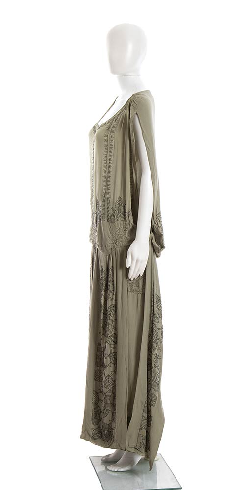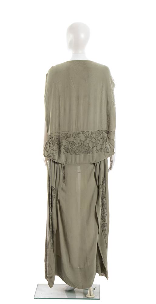 abitoAbito 1925 ca in crepe di seta grigio chiaro ricamato, grado di condizione generale D (piccoli buchi, leggere macchie)